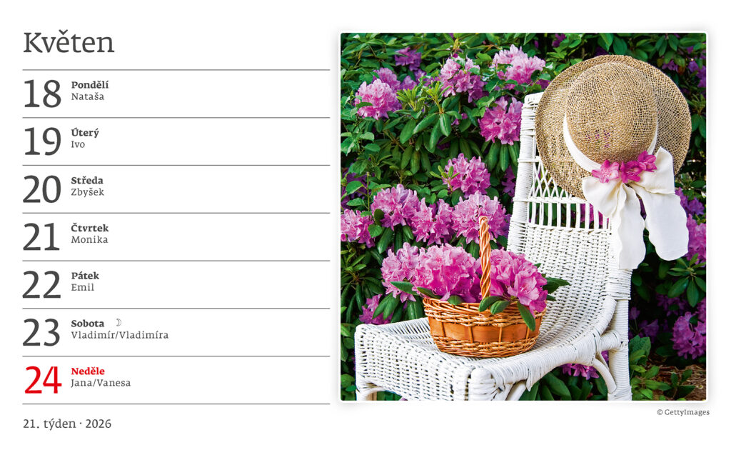 Formát kalendáře: 22,6 x 13,9 cm Kalendárium: české týdenní řádkové Počet stran kalendáře: 58 + 2 Stojánek: se zámkem Prostor pro přítisk: 22,6 x 3 cm
