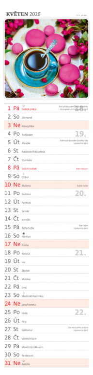 Formát kalendáře: 12 x 48 cm Kalendárium: české měsíční jmenné Rozsah kalendáře: 13 listů Vazba: Twin-wire (se spirálou)