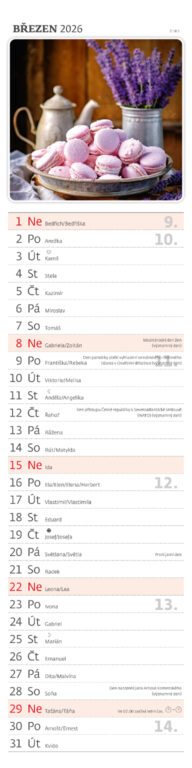 Formát kalendáře: 12 x 48 cm Kalendárium: české měsíční jmenné Rozsah kalendáře: 13 listů Vazba: Twin-wire (se spirálou)