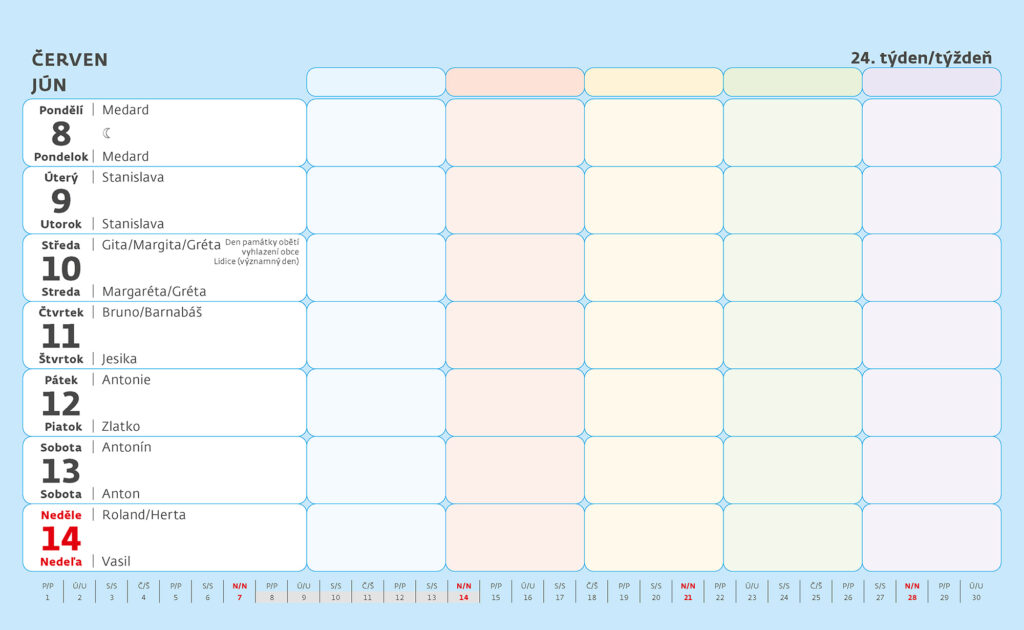 Formát kalendáře: 22,6 x 13,9 cm Kalendárium: české/slovenské týdenní řádkové Počet stran kalendáře: 58 + 2 Stojánek: se zámkem Prostor pro přítisk: 22,6 x 3 cm + políčko pro každého z rodiny Umístění na stůl i na zeď