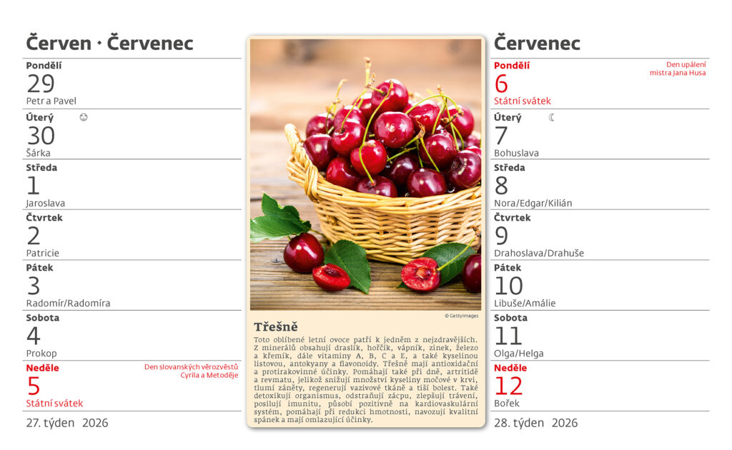 Formát kalendáře: 22,6 x 13,9 cm Kalendárium: české dvoutýdenní řádkové Počet stran kalendáře: 28 + 2 Stojánek: se zámkem Prostor pro přítisk: 22,6 x 3 cm