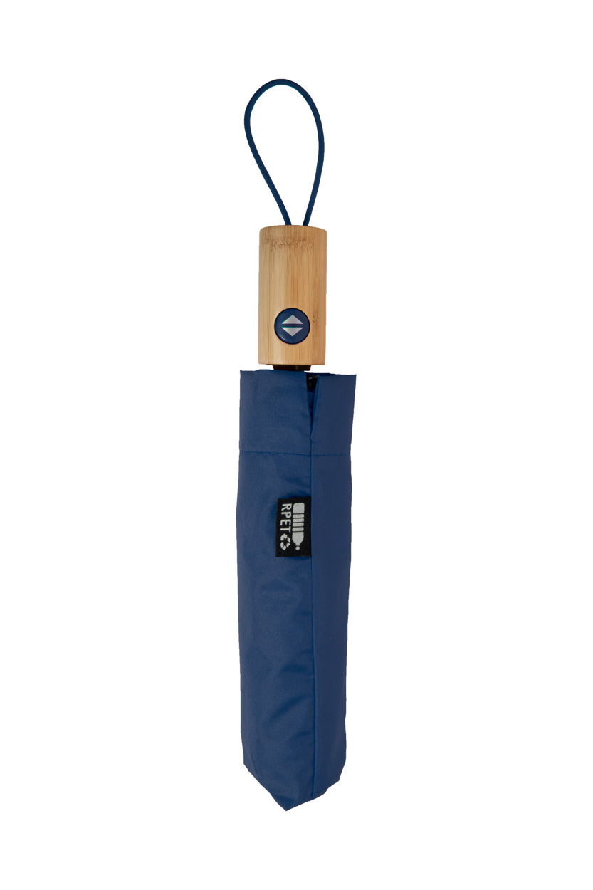 Plně automatický (otevřít/zavřít), větruodolný skládací deštník s 8 panely v pouzdře v odpovídající barvě. S kovovým rámem, sklolaminátovými žebry a bambusovou rukojetí. Pongee 190T RPET. S výrazným štítkem RPET.
