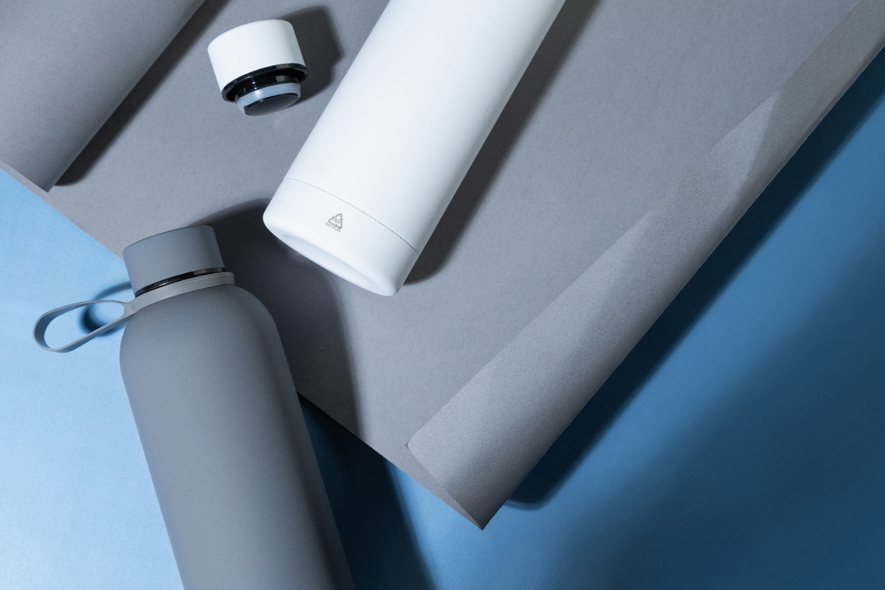 Dvoustěnná vakuová láhev z recyklované nerezové oceli s pogumovanou úpravou a silikonovým páskem, 500 ml.