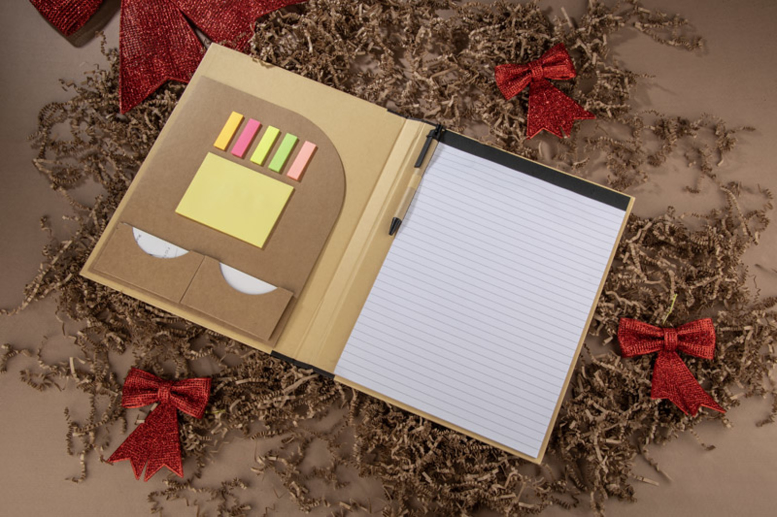 Konferenční kufřík DOSI A4 je všestranný a praktický přístroj, ideální pro obchodní jednání a konference. Obsahuje linkovaný blok, kapsu na dokumenty a dvě menší kapsy na vizitky a poznámky. Složka je polstrovaná a dodává se s papírovým perem, žlutými samolepicími poznámkami a sadou malých kartiček, které jsou ideální pro označení důležitých míst v poznámkách. DOSI se uzavírá gumičkou, aby se dokumenty neztratily. Vyrobeno z papíru, který je ekologickou alternativou ke složkám ze syntetických materiálů.