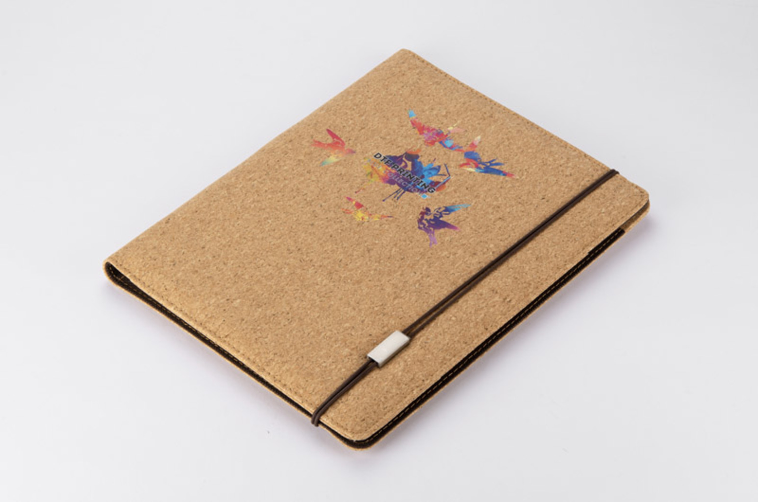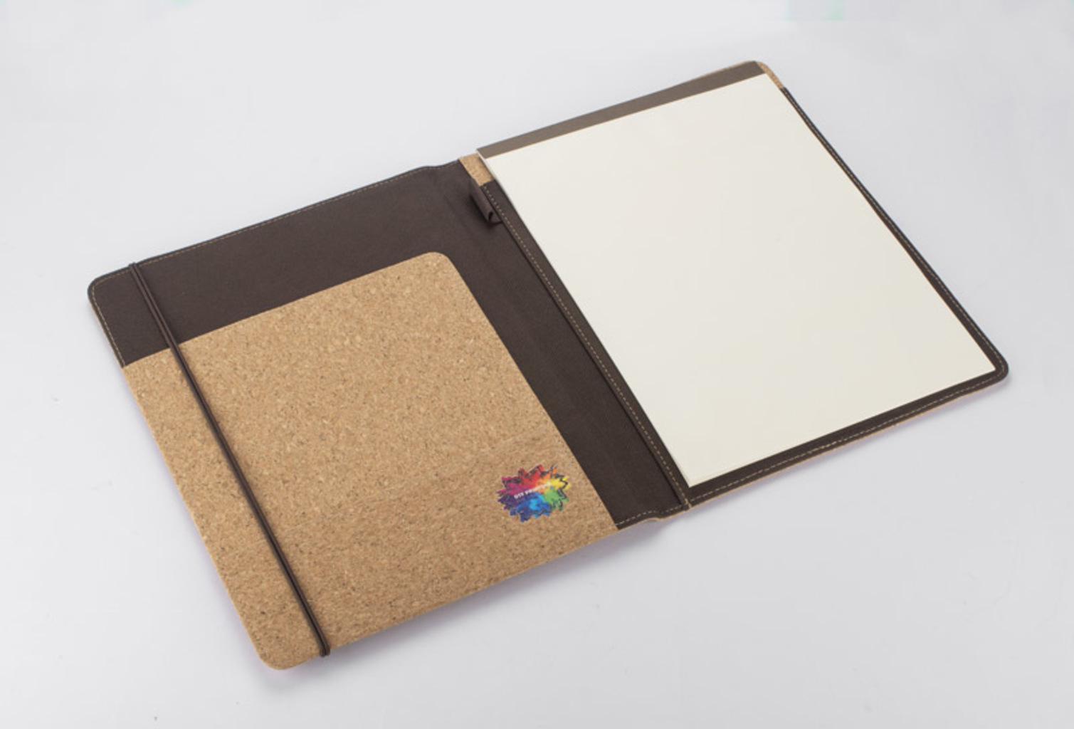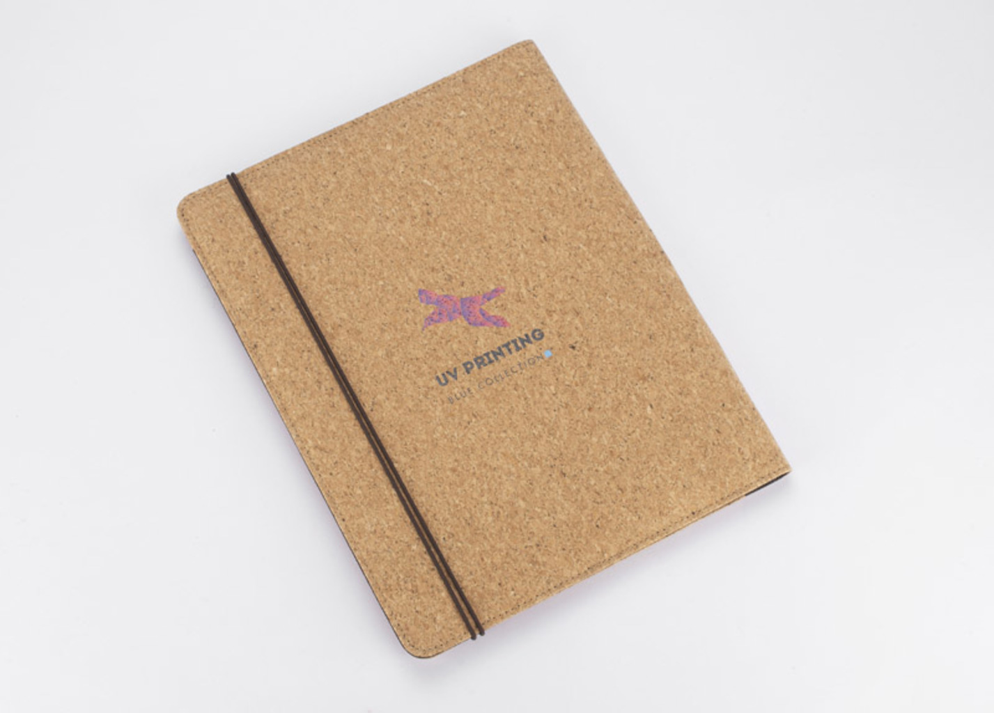 Korková složka A4 s poznámkovým blokem. Obsahuje velkou kapsu na dokumenty, dvě menší kapsy a místo na pero. Uzavíratelný pomocí gumičky s kovovým prvkem. Baleno v netkaném sáčku.
