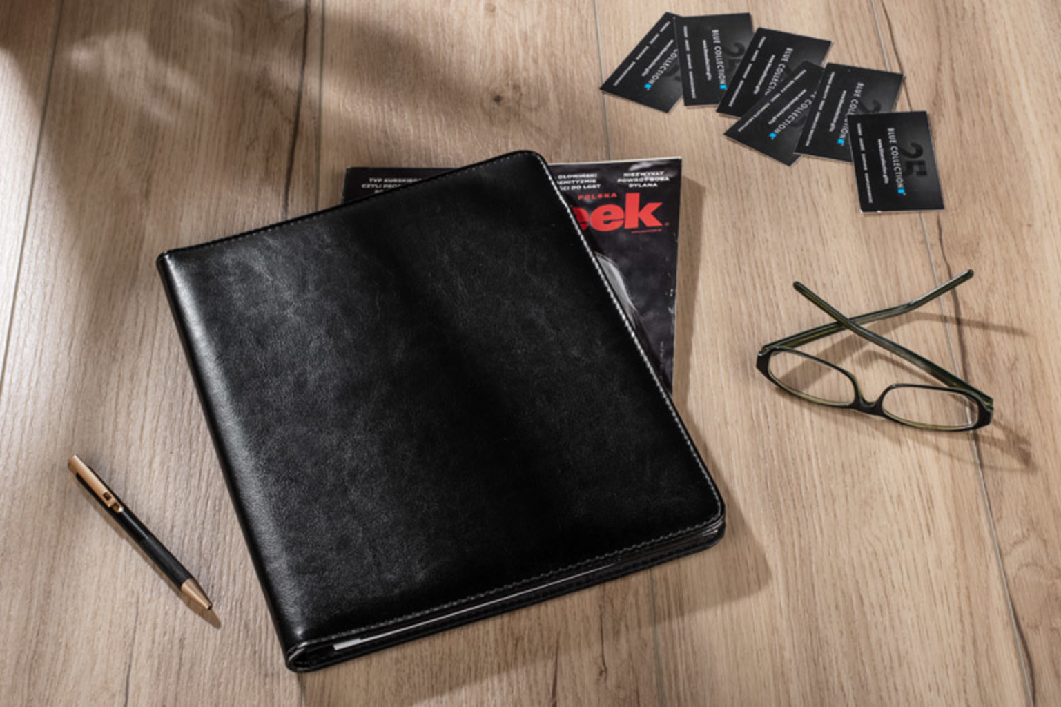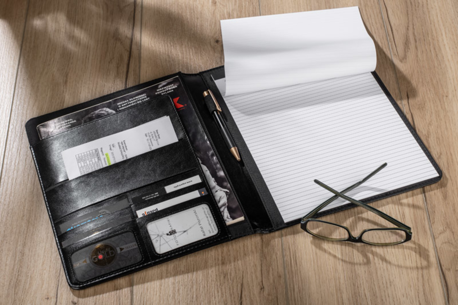 Elegantní, klasická aktovka z materiálu podobného kůži (PU). Uvnitř 1 velká kapsa na dokumenty, 1 střední kapsa a 6 malých kapes, např. na vizitky. Součástí je linkovaný zápisník (20 listů A4). Poznámkový blok není pevně uchycen, ale zasouvá se do kapsy, takže jej lze snadno vyměnit. Na povrch složky lze různými technikami aplikovat vaše logo.