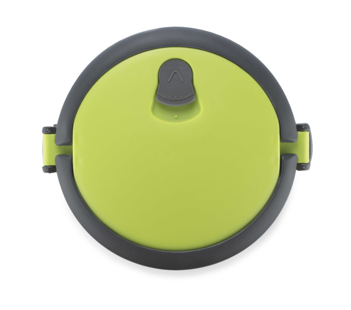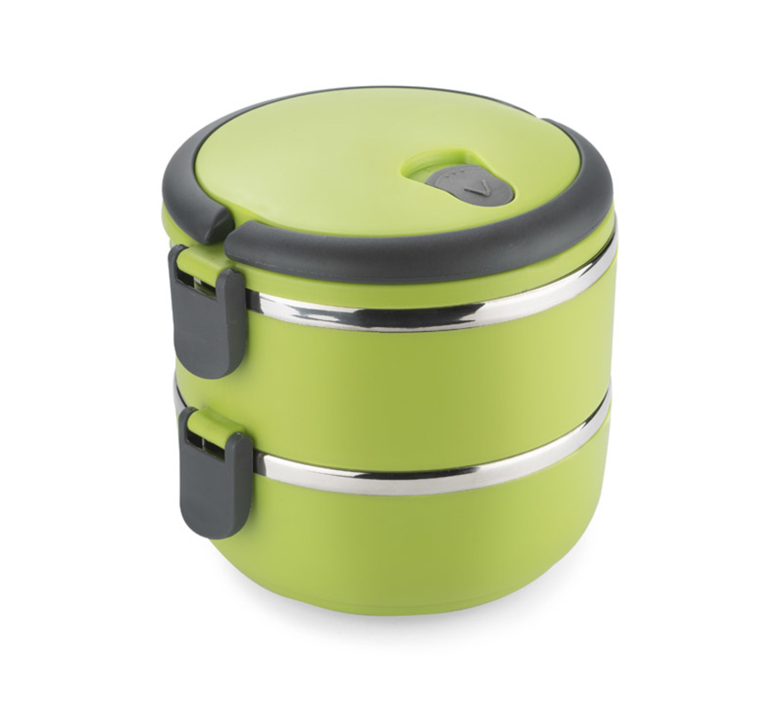 Kontejner s vnitřkem z nerezové oceli je rozdělen do dvou částí, které lze skládat, což zajišťuje pohodlný a pohodlný přenos dvouchodových jídel. Horní komora je vybavena těsněním. Plastové madla jsou sklopná. Celková kapacita: 1400 ml.