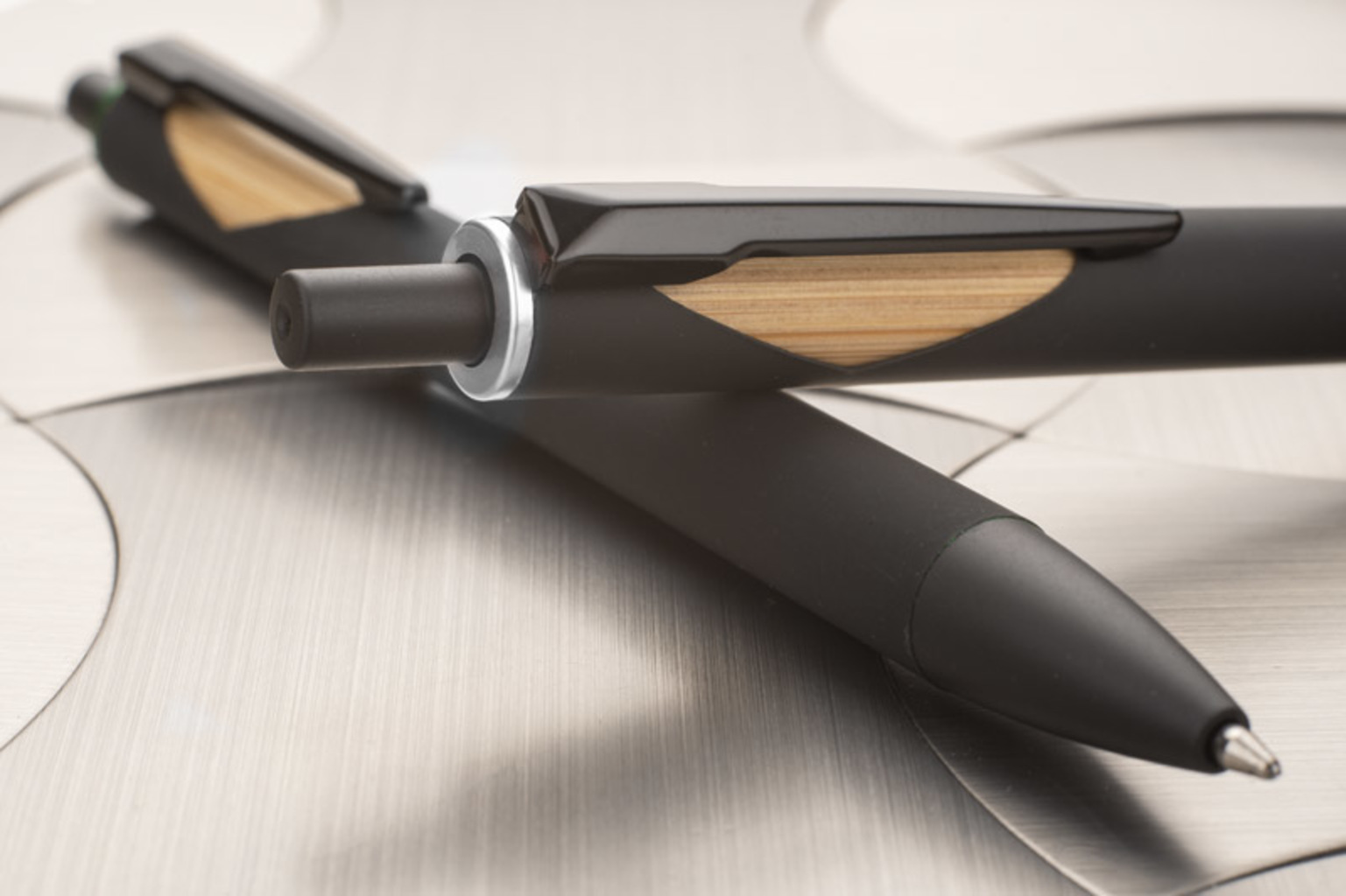 Pero FRANK má na dotek příjemný povrch. Bambusový prvek a kovová povrchová úprava dodávají peru elegantní a moderní vzhled.