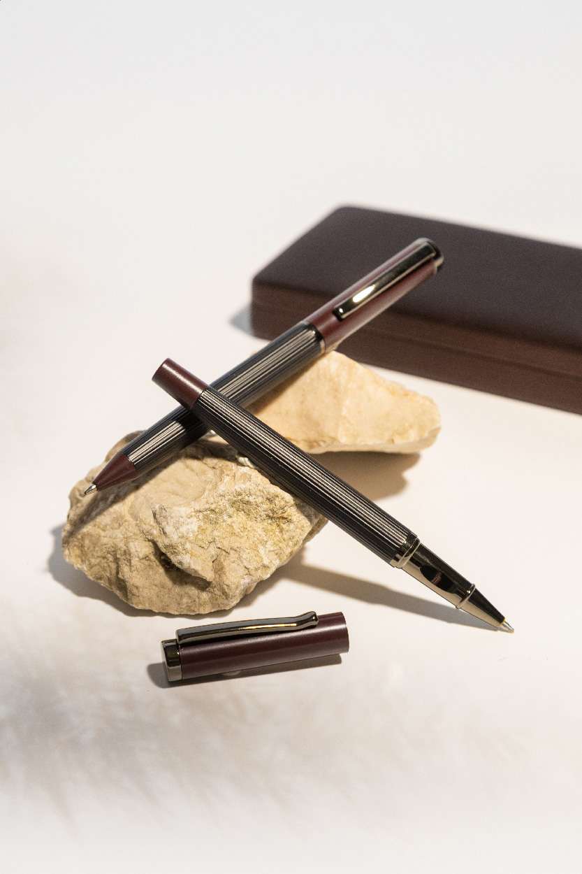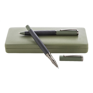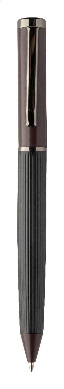 Elegantní sada kovového kuličkového pera a rolleru s pruhovaným tělem, barevnými akcenty a lesklými detaily v barvě antracit. V barevně sladěné dárkové krabičce a s modrou náplní. Produkt značky André Philippe.