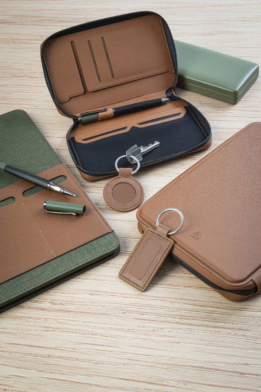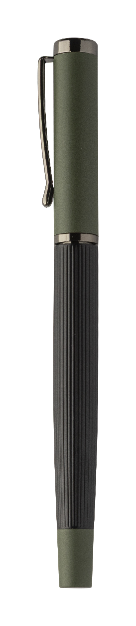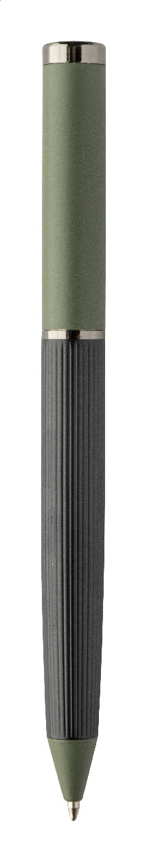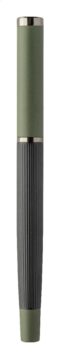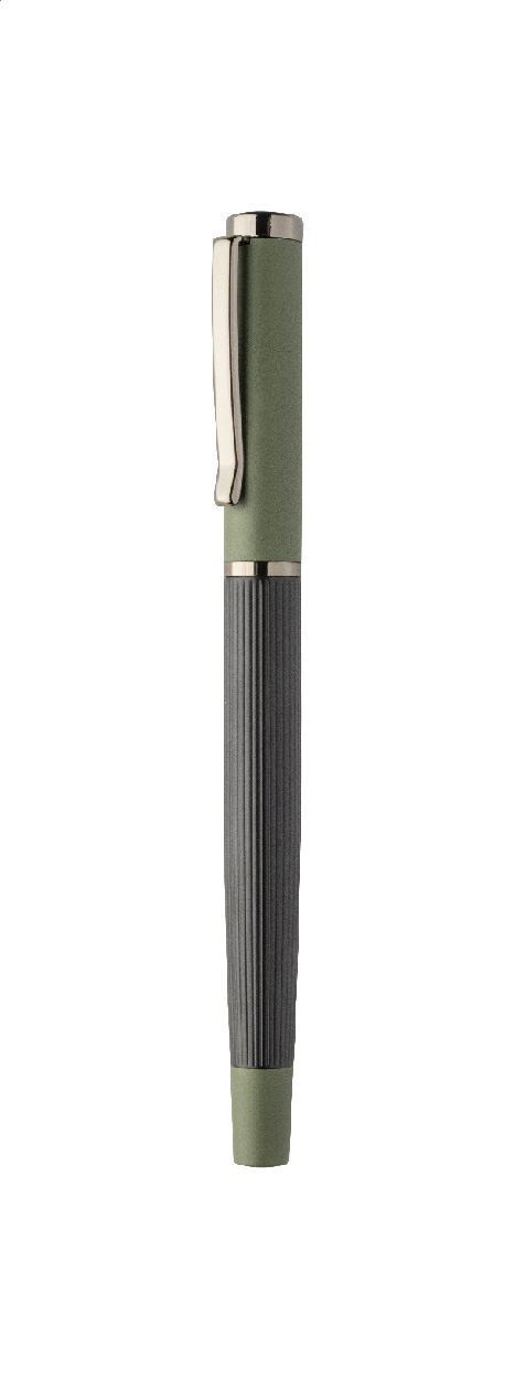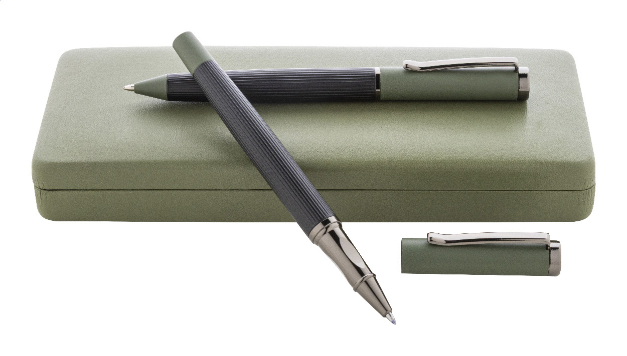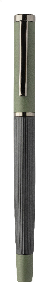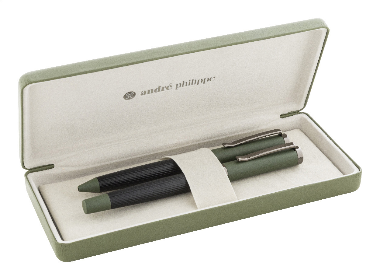 Elegantní sada kovového kuličkového pera a rolleru s pruhovaným tělem, barevnými akcenty a lesklými detaily v barvě antracit. V barevně sladěné dárkové krabičce a s modrou náplní. Produkt značky André Philippe.