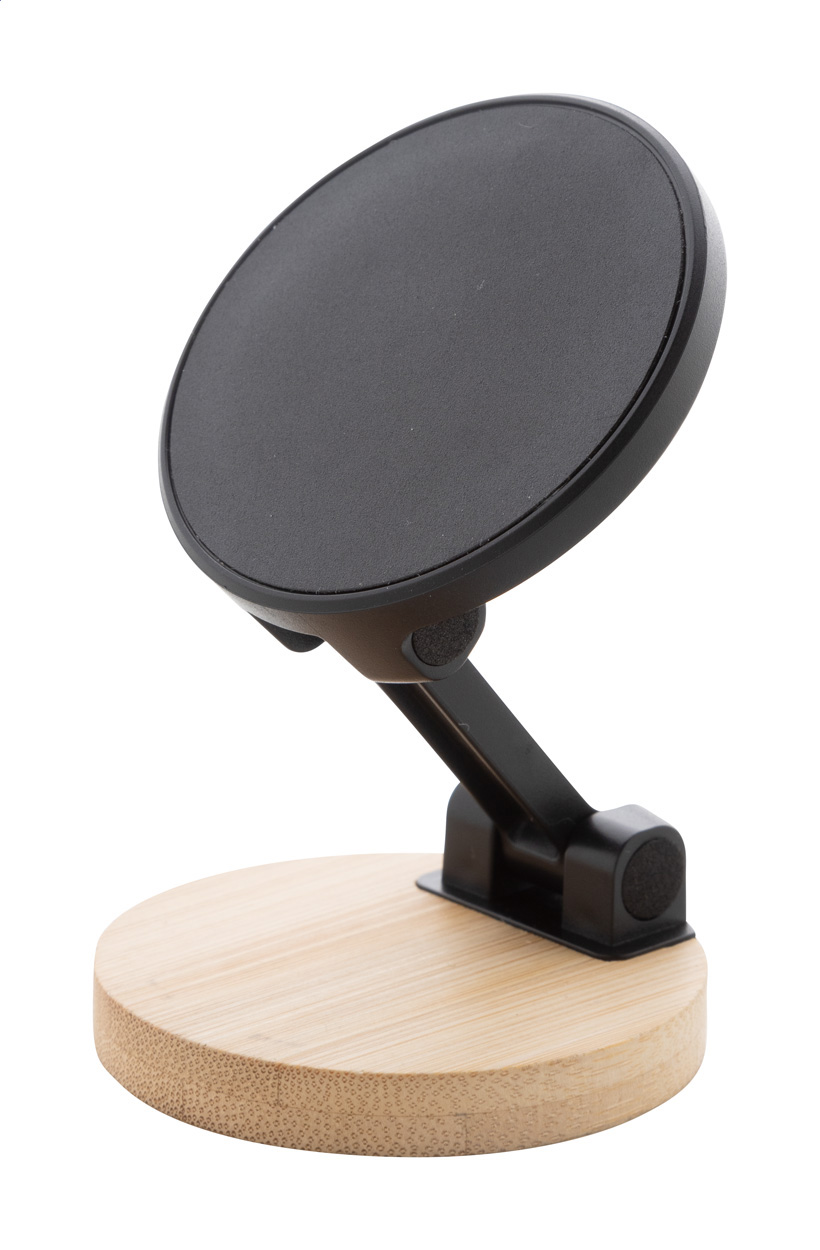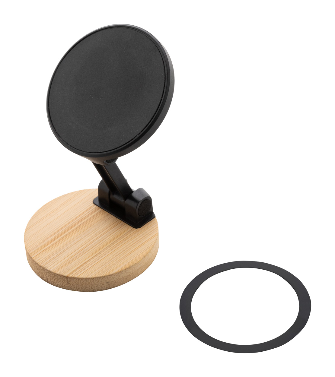 Magnetický stolní držák mobilního telefonu z bambusu a recyklovaného ABS. Včetně samolepícího kovového kroužku pro použití magnetické funkce na jakémkoli zařízení. Kompatibilní s iPhone® 12 nebo novějším.