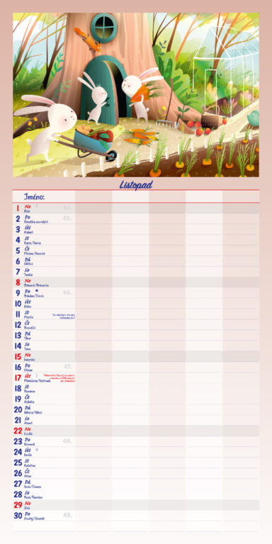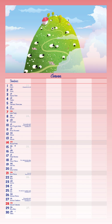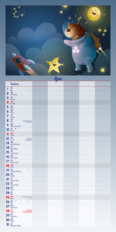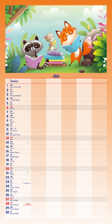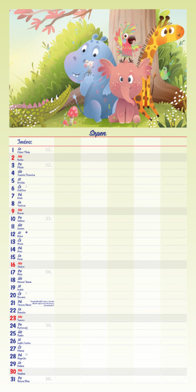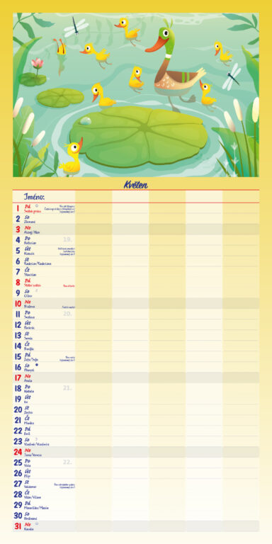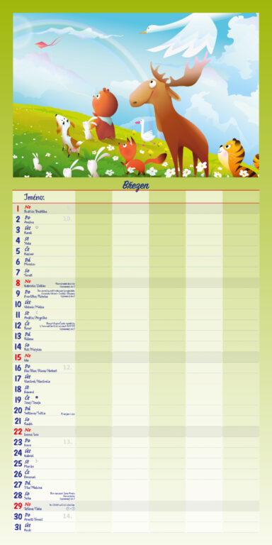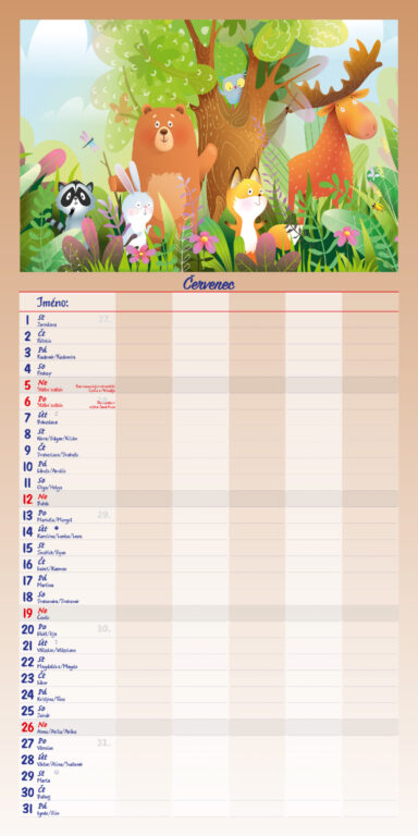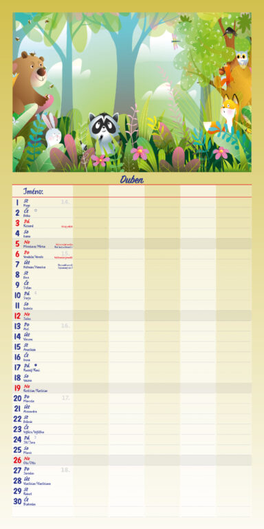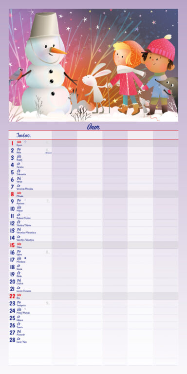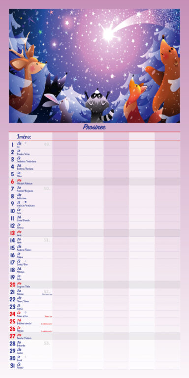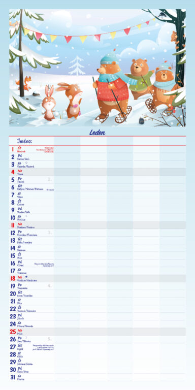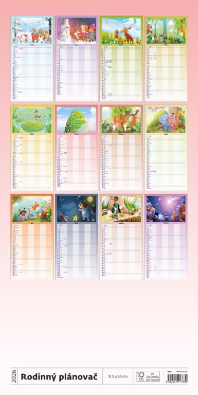 Formát kalendáře: 31,5 x 63 cm Kalendárium: české měsíční jmenné Rozsah kalendáře: 14 listů Vazba: Twin-wire (se spirálou) + políčko pro každého z rodiny