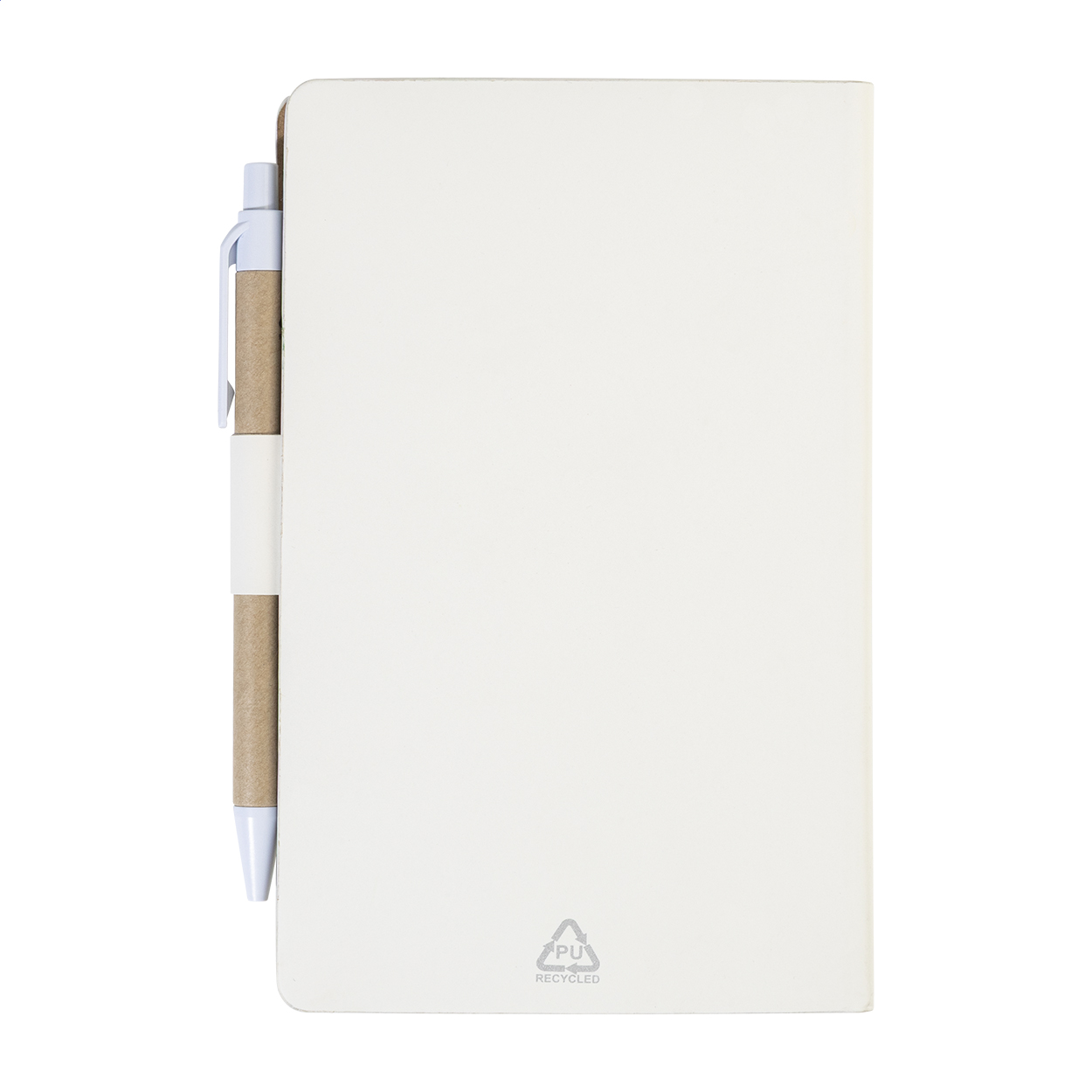 Blok s recyklovanou PU kůží, 70 linkovanými listy z recyklovaného papíru a 125 značkovači stránek (v 5 různých barvách). Včetně recyklovaného papíru a kuličkového pera z recyklovaného PP s modrou náplní.