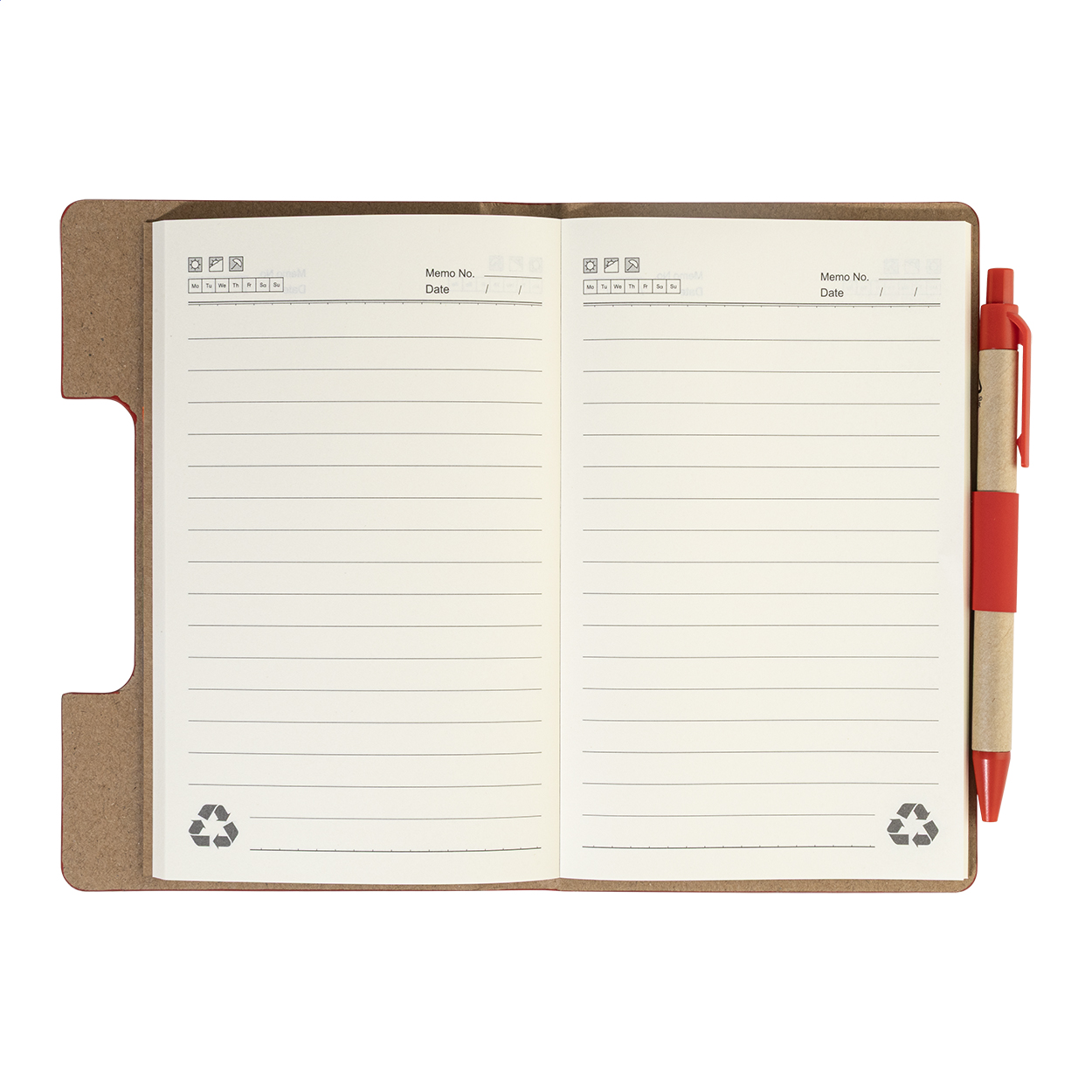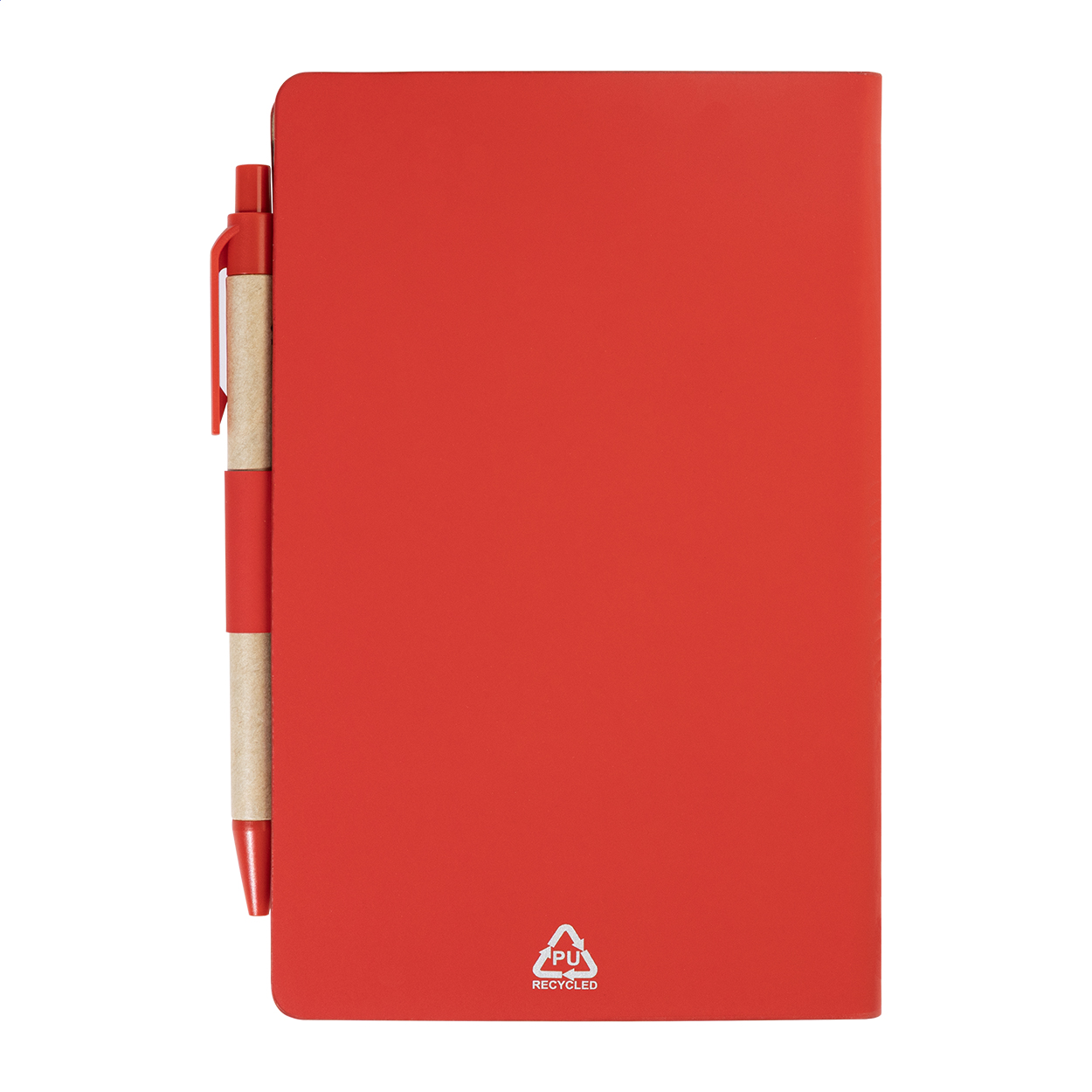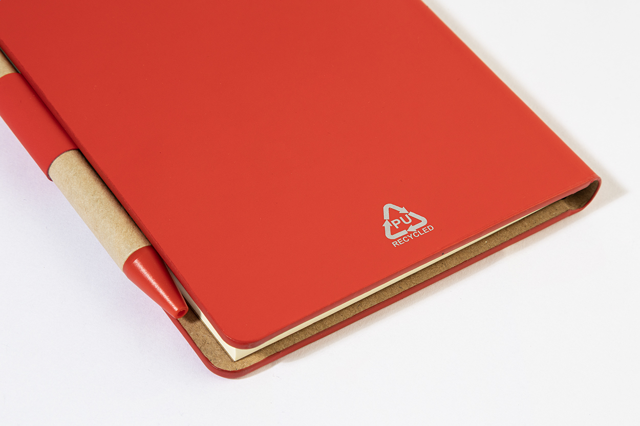 Blok s recyklovanou PU kůží, 70 linkovanými listy z recyklovaného papíru a 125 značkovači stránek (v 5 různých barvách). Včetně recyklovaného papíru a kuličkového pera z recyklovaného PP s modrou náplní.