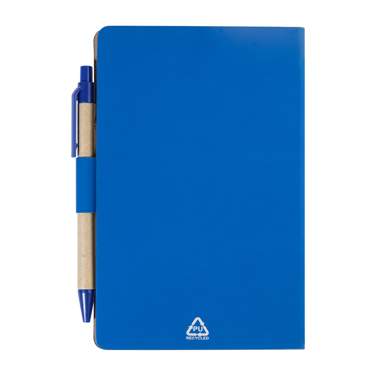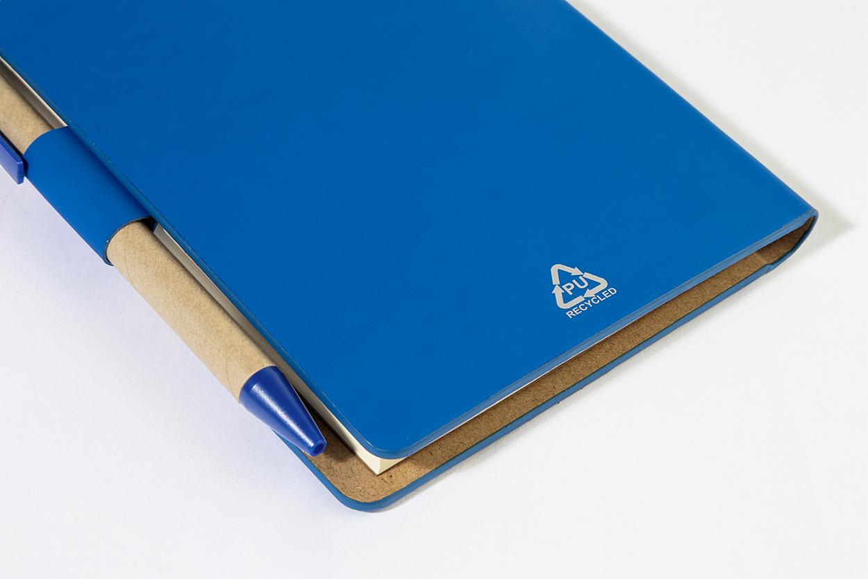 Blok s recyklovanou PU kůží, 70 linkovanými listy z recyklovaného papíru a 125 značkovači stránek (v 5 různých barvách). Včetně recyklovaného papíru a kuličkového pera z recyklovaného PP s modrou náplní.