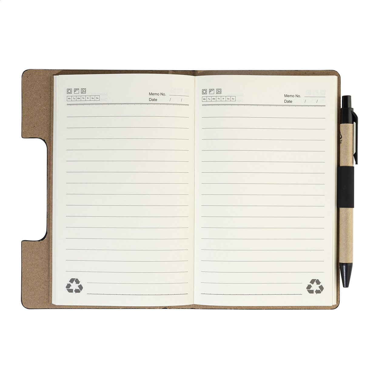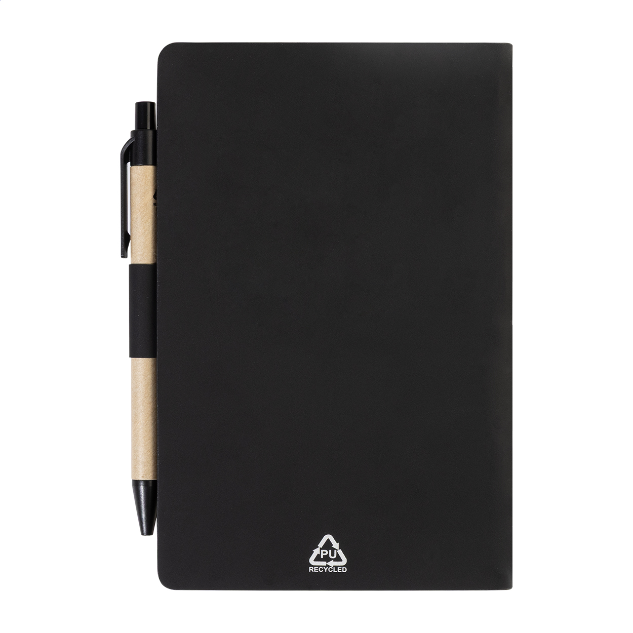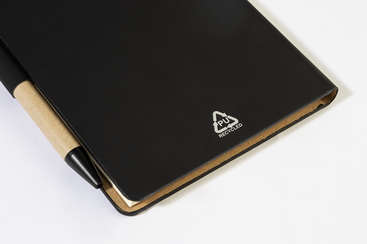 Blok s recyklovanou PU kůží, 70 linkovanými listy z recyklovaného papíru a 125 značkovači stránek (v 5 různých barvách). Včetně recyklovaného papíru a kuličkového pera z recyklovaného PP s modrou náplní.