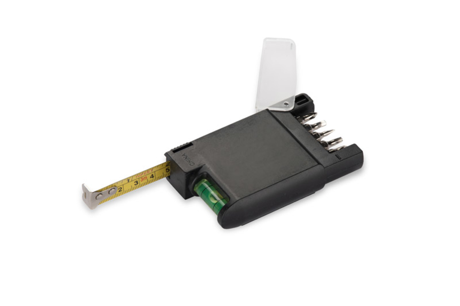 Multifunkční nástroj ALGO je vybaven 3metrovým měřicím pásem, vodováhou a vestavěným šroubovákem s vyměnitelnými bity. Umožňuje měření, montáž a vyrovnávání.
