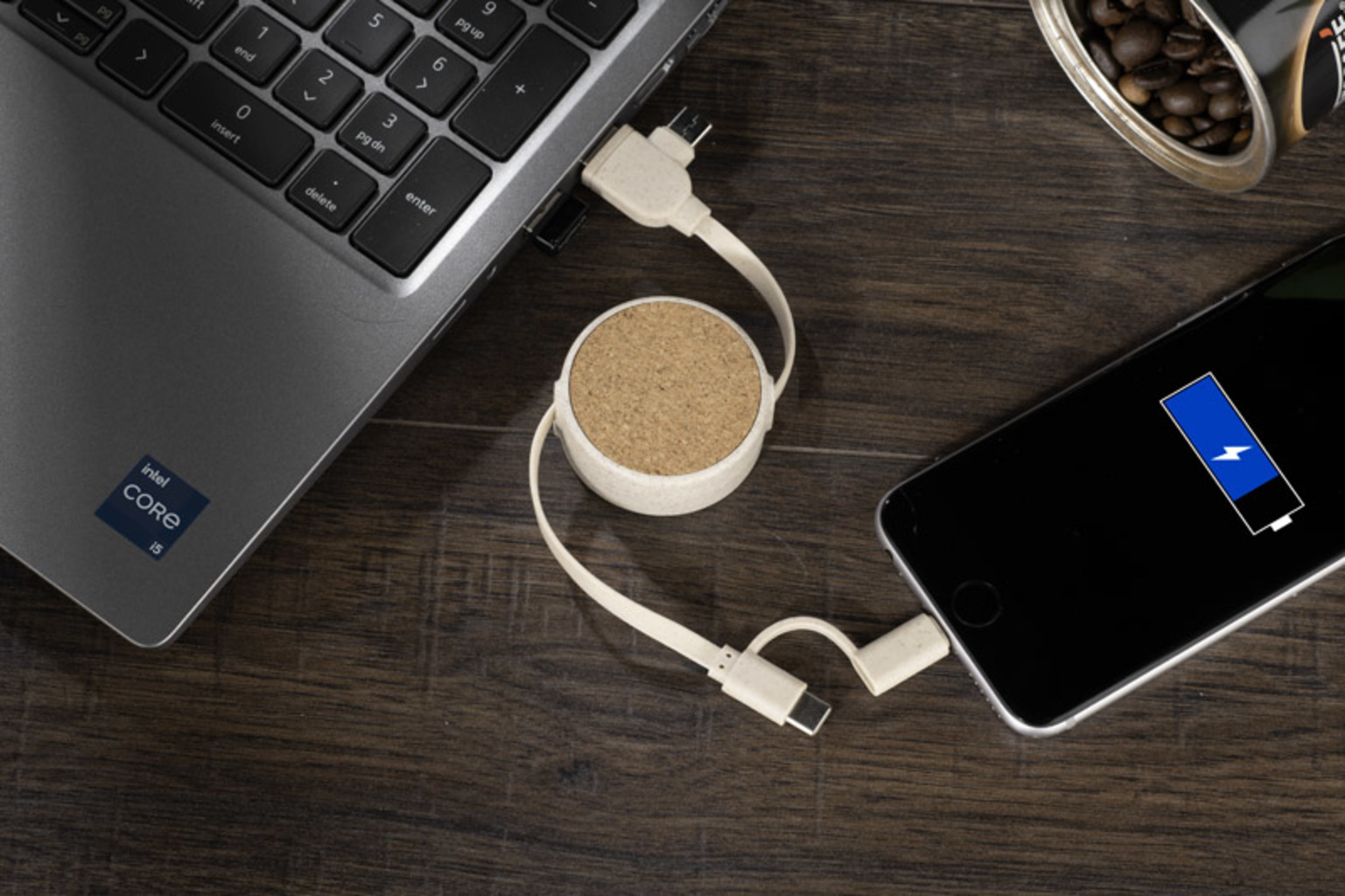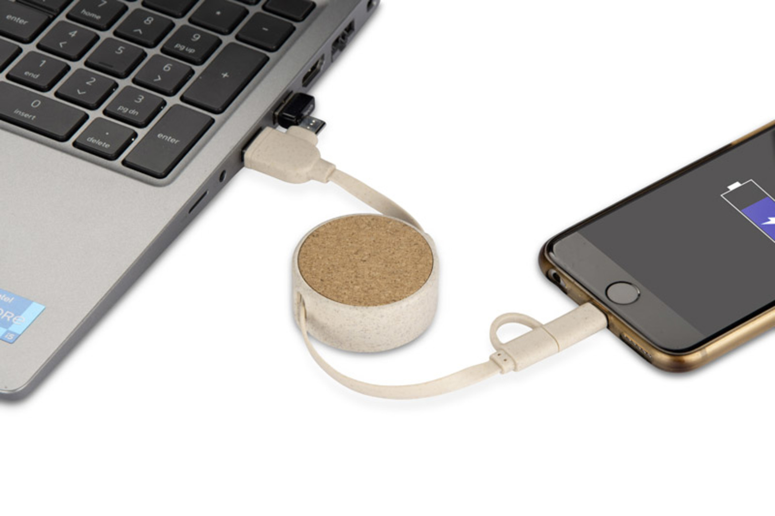 Kabel na nabíjení SLOPI kombinuje přírodní materiály s funkcionalitou. Vyrobený z korku a plastu ze pšeničné slámy, nabízí konektory USB, 2 x USB C a Lightning, což zajišťuje všestrannost a pohodlí. Jeho smotaný design usnadňuje skladování a přírodní vzhled mu dodává jedinečný charakter. Ideální jako praktický propagační dárek.