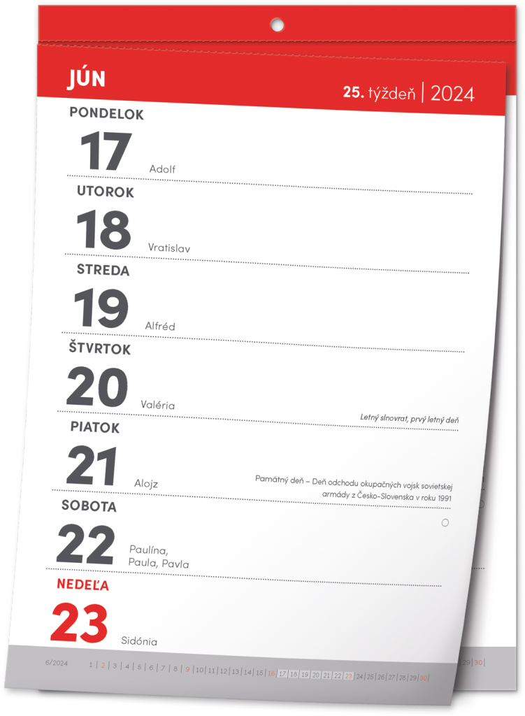 Nástěnný trhací kalendář, s nímž vám rok doslova uteče před očima. Praktický formát A5 je vhodný do každé místnosti. Týdenní kalendárium obsahuje slovenská jména, svátky a památné dny a přehled aktuálního měsíce u každého týdne.