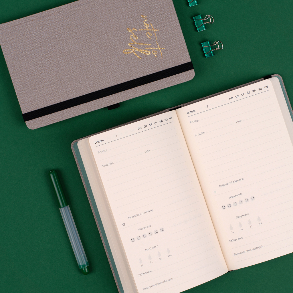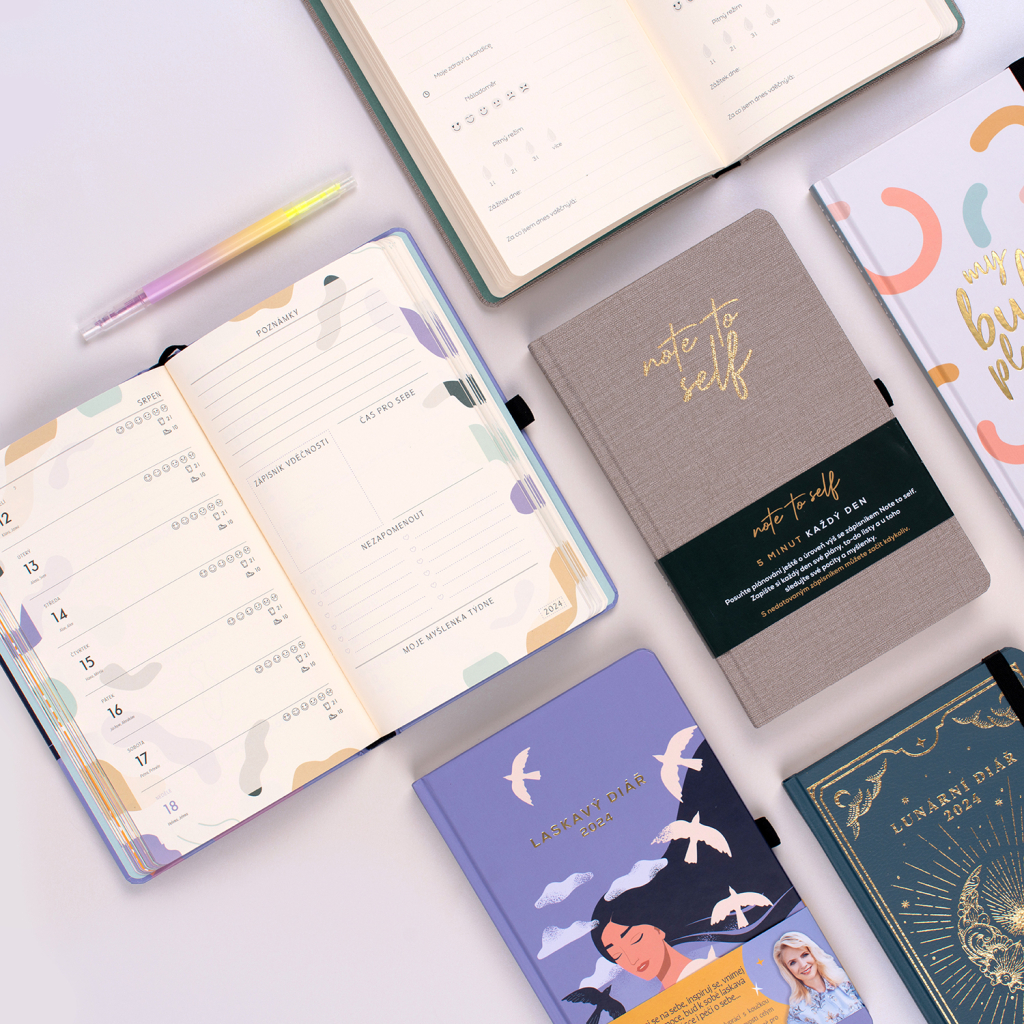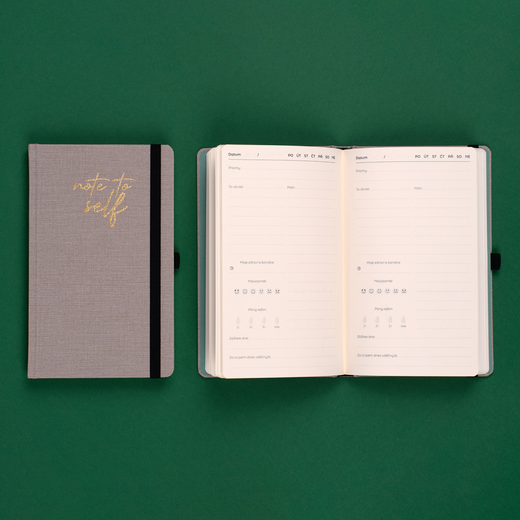 Posuňte svoje plánování ještě o úroveň výš s diářem Note to self. Pokud nad deníkem strávíte 5 minut denně, např. při pití ranní kávy, budete šťastnější, uvolněnější a výkonnější. Zpomalte a zamyslete se nad organizací vašich aktivit. K tomu vám pomůže týdenní rozvržení a místo pro sledování návyků, sebereflexi a pokroky v osobních cílech. S nedatovaným diářem můžete začít kdykoliv chcete.