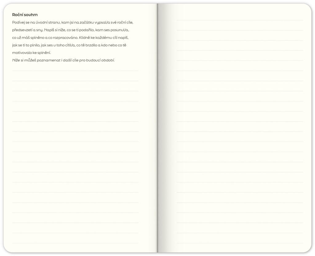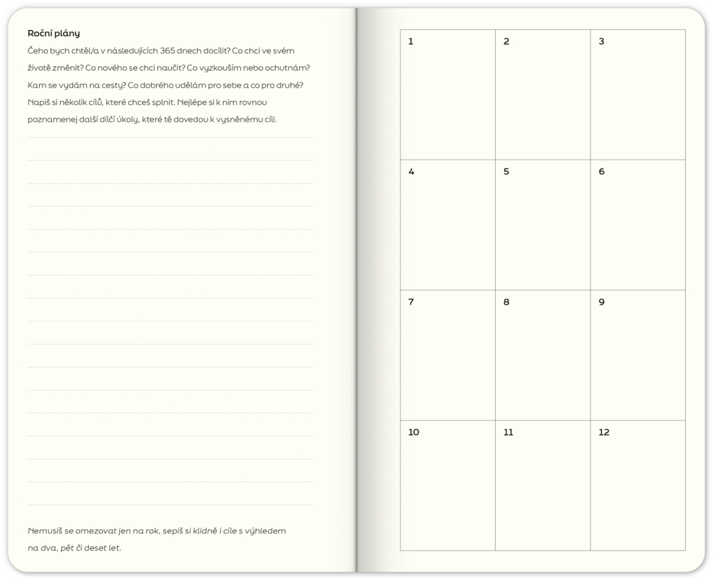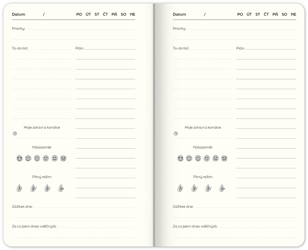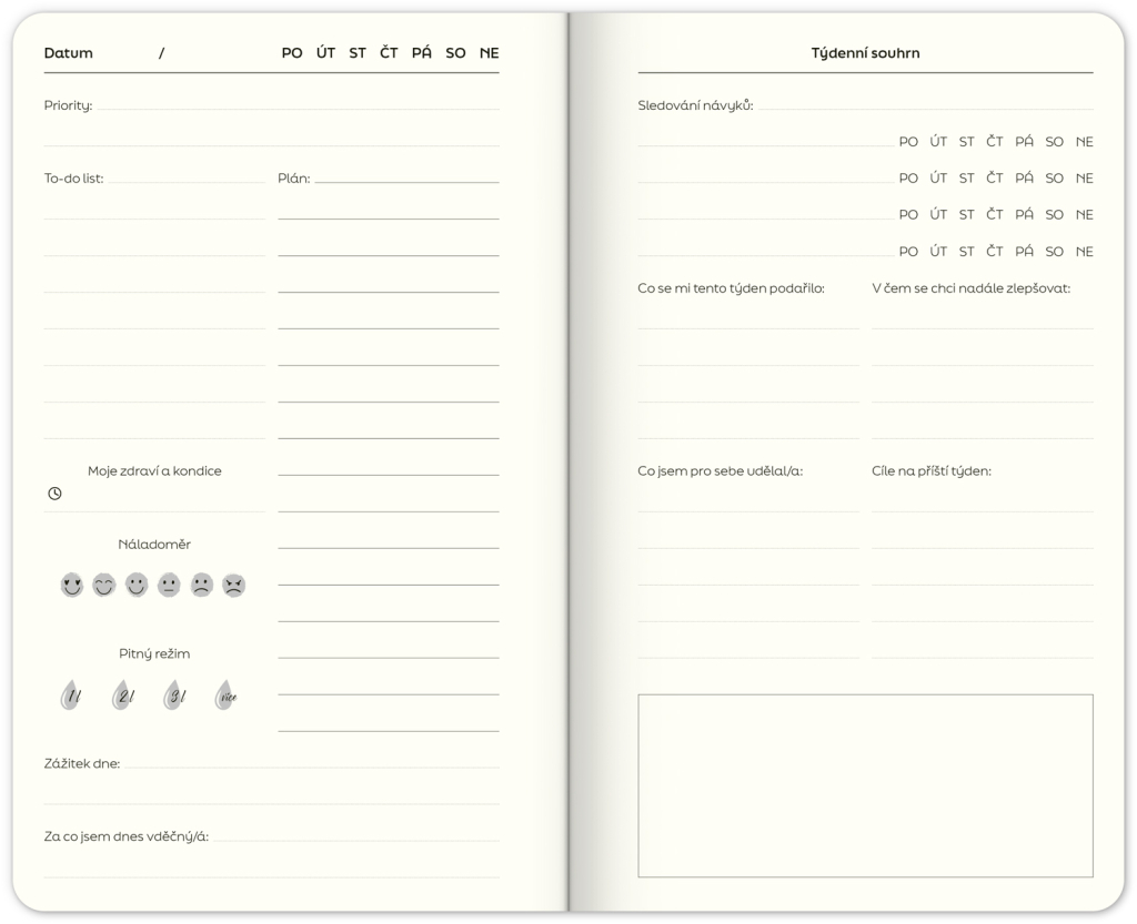 Posuňte svoje plánování ještě o úroveň výš s diářem Note to self. Pokud nad deníkem strávíte 5 minut denně, např. při pití ranní kávy, budete šťastnější, uvolněnější a výkonnější. Zpomalte a zamyslete se nad organizací vašich aktivit. K tomu vám pomůže týdenní rozvržení a místo pro sledování návyků, sebereflexi a pokroky v osobních cílech. S nedatovaným diářem můžete začít kdykoliv chcete.