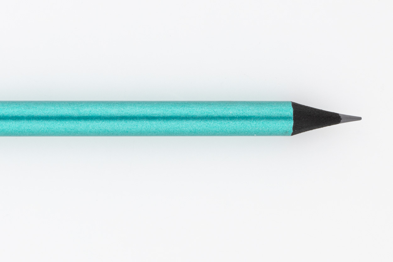 Černá dřevěná tužka v metalickém provedení, s černou gumou. Ořezaná, třída HB.