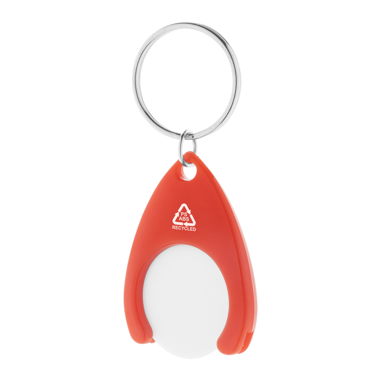 Přívěšek na klíče z recyklovaného ABS a recyklovaného plastu PS se žetonem do nákupního vozíku a kovovým kroužkem. Velikost mince: ø24×2 mm.