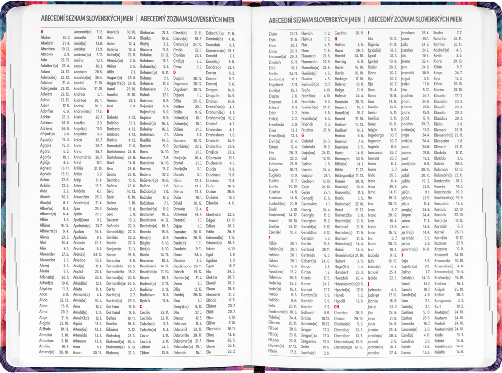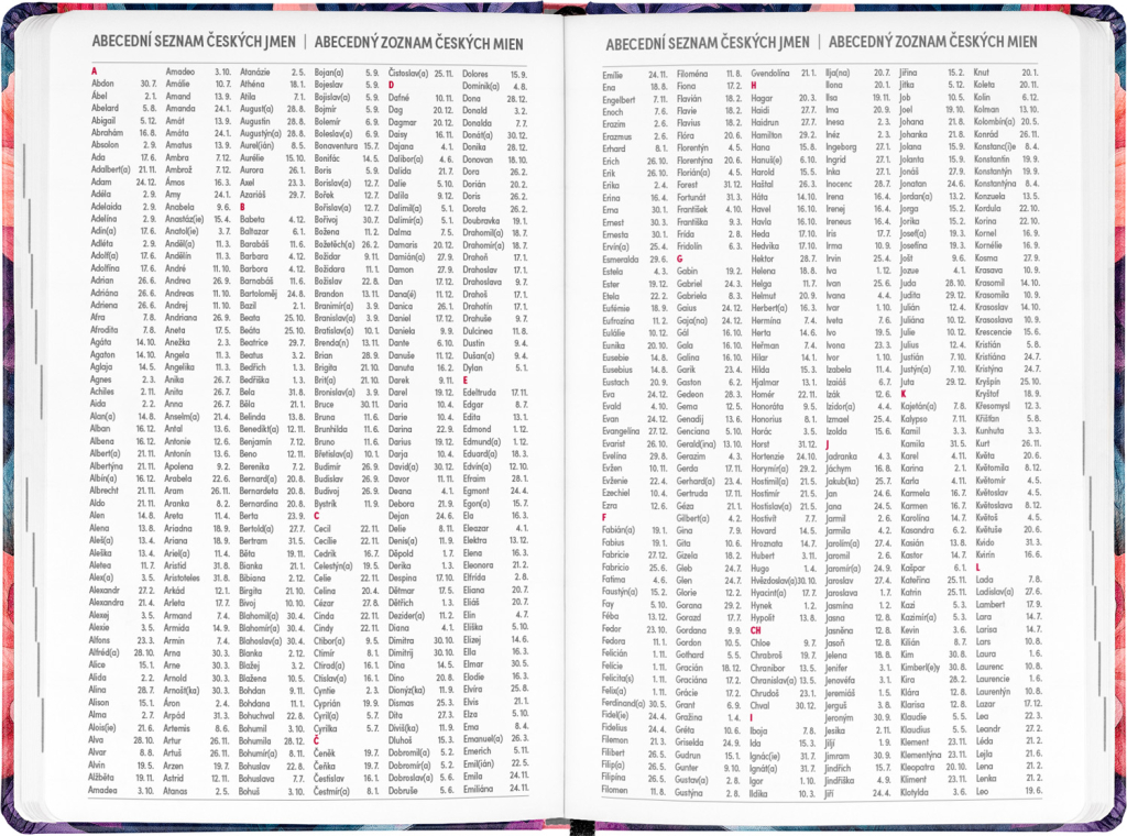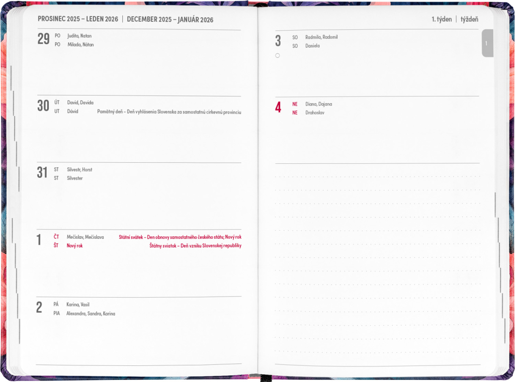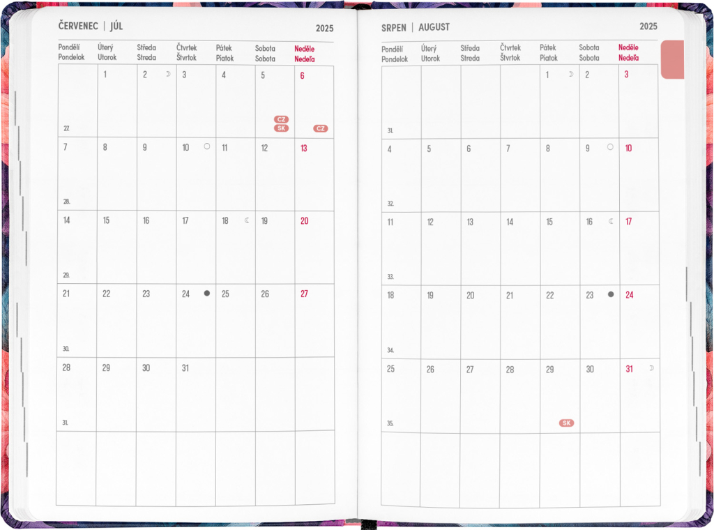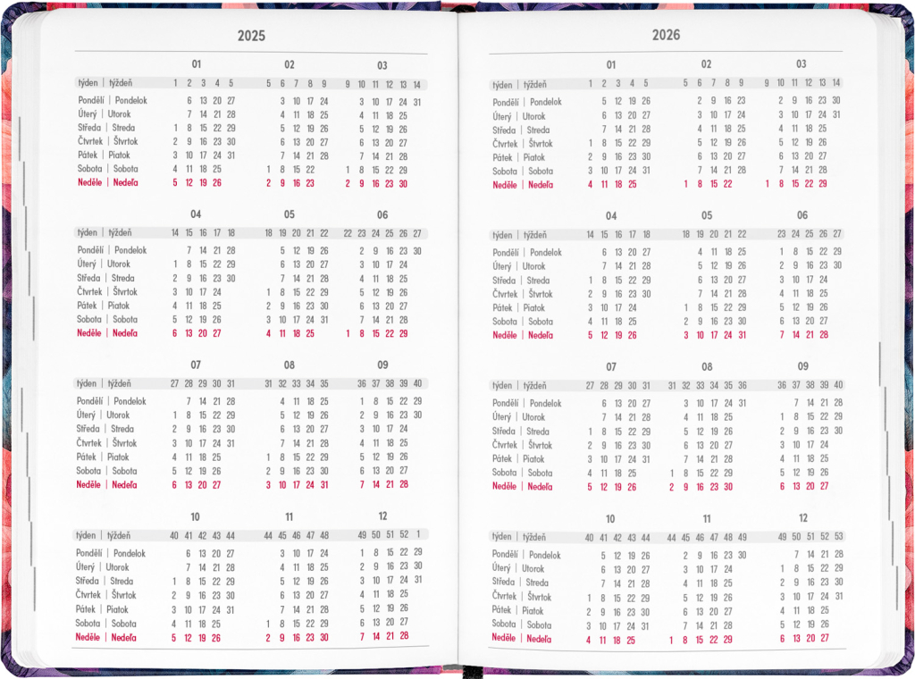 Osmnáctiměsíční diář obsahuje přehled na rok 2025 a 2026, seznam českých a slovenských jmen, česko-slovenské týdenní řádkové kalendárium se jmény a svátky a prostor na poznámky. Kalendárium začíná v červenci 2025 a končí v prosinci 2026.