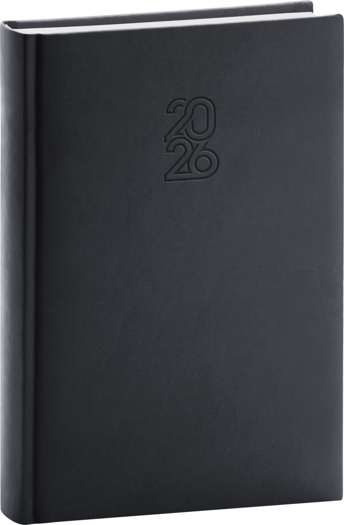 Denní diář Aprint 2026 v černé barvě. Kolekce vsadila na osvědčené barvy, které doplňuje nová ražba letopočtu. Denní rozvrh s česko-slovenským kalendáriem a doplňkovou angličtinou, němčinou, maďarštinou a ruštinou.