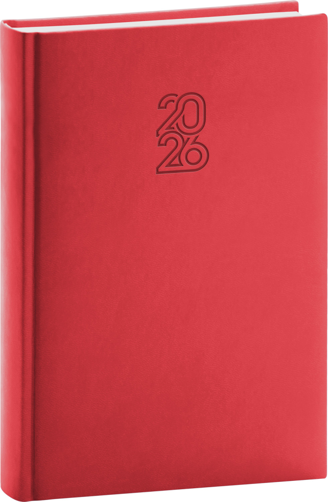 Denní diář Aprint 2026 v červené barvě. Kolekce vsadila na osvědčené barvy, které doplňuje nová ražba letopočtu. Denní rozvrh s česko-slovenským kalendáriem a doplňkovou angličtinou, němčinou, maďarštinou a ruštinou.