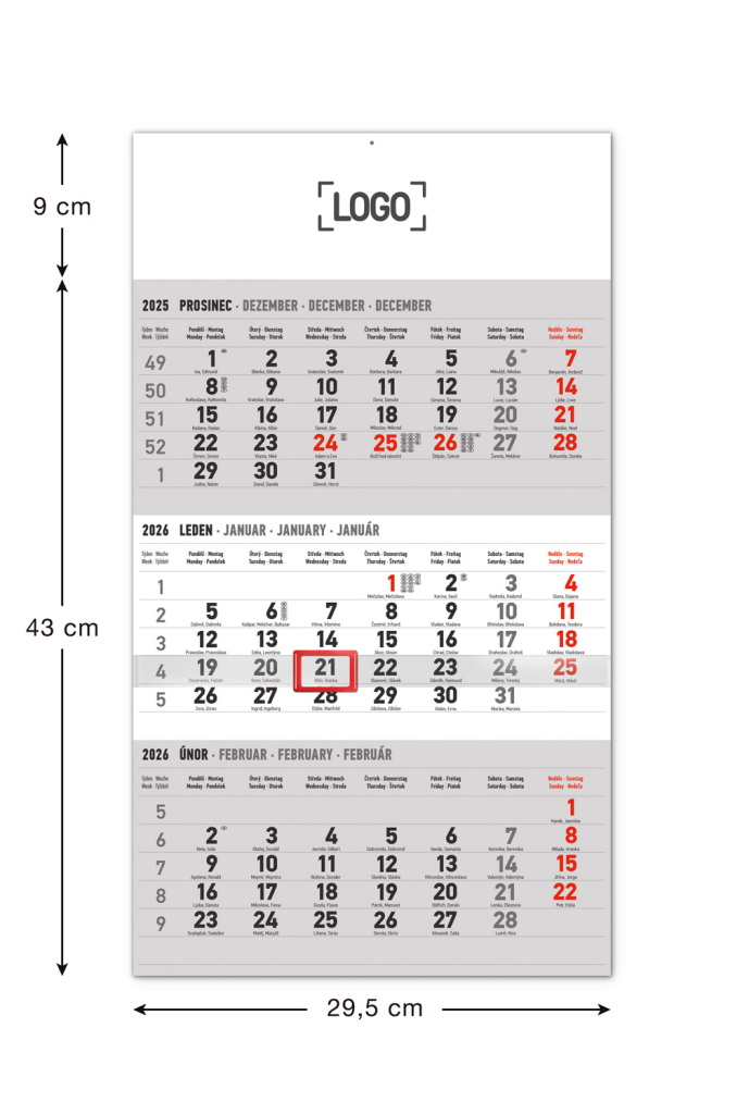Praktický plánovací kalendář s tříměsíčním rozložením a orientační lištou s posuvným jezdcem. Obsahuje kalendárium s českými jmény a světovými svátky na šedém pozadí.