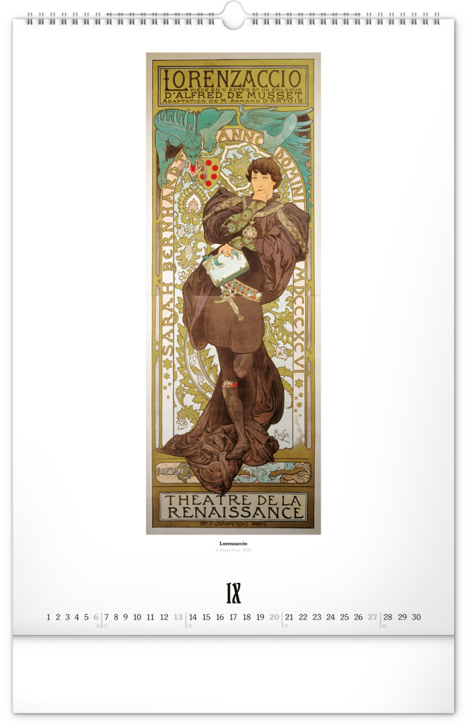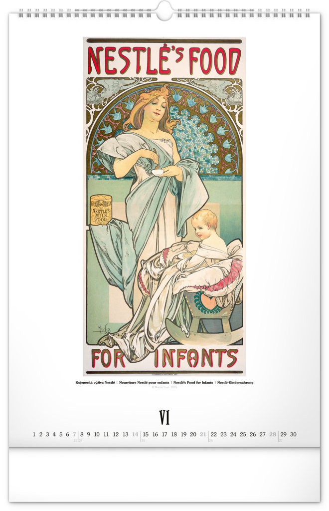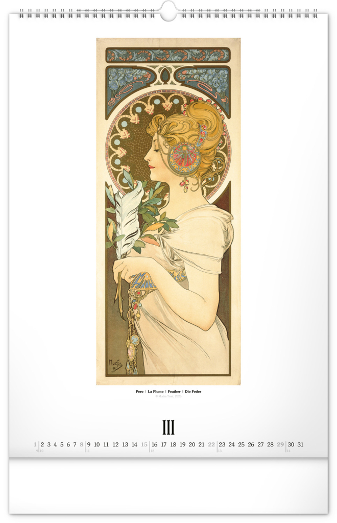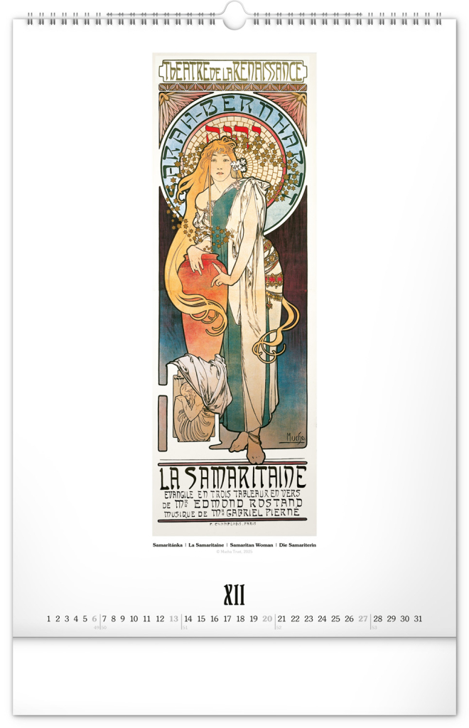 Nástěnný kalendář ve velkém formátu s reprodukcemi obrazů oblíbeného secesního malíře českého původu. Reprodukce doplňuje vkusné univerzální kalendárium s vyznačenými nedělemi a popisky děl ve čtyřech jazycích (CZ, FR, EN, DE).