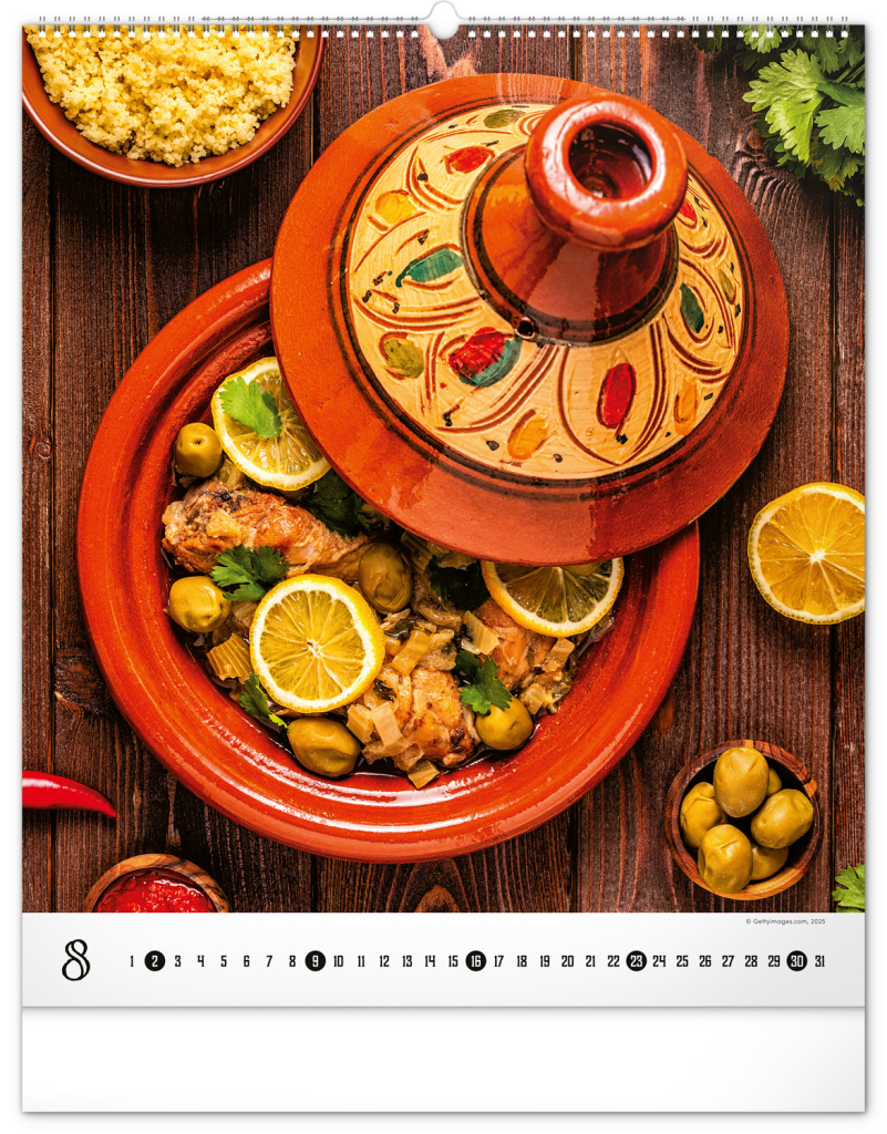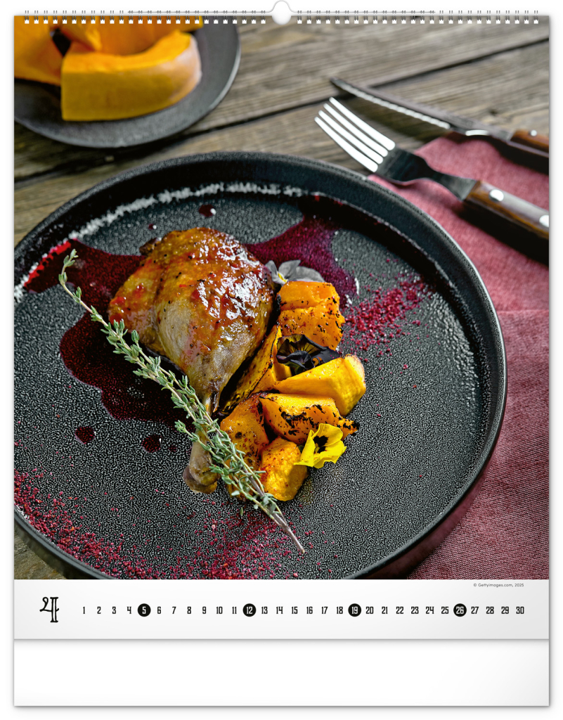 Velkoformátový kalendář z kolekce Platinum Collection obsahuje fotografie luxusních pokrmů, které budete chtít ochutnat. Šťavnaté steaky, křidýlka i stehýnka nebo oku lahodící dezerty oživí interiér v každé kuchyni či jídelně. Kalendář zahrnuje jednoduché kalendárium.