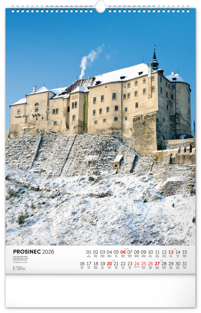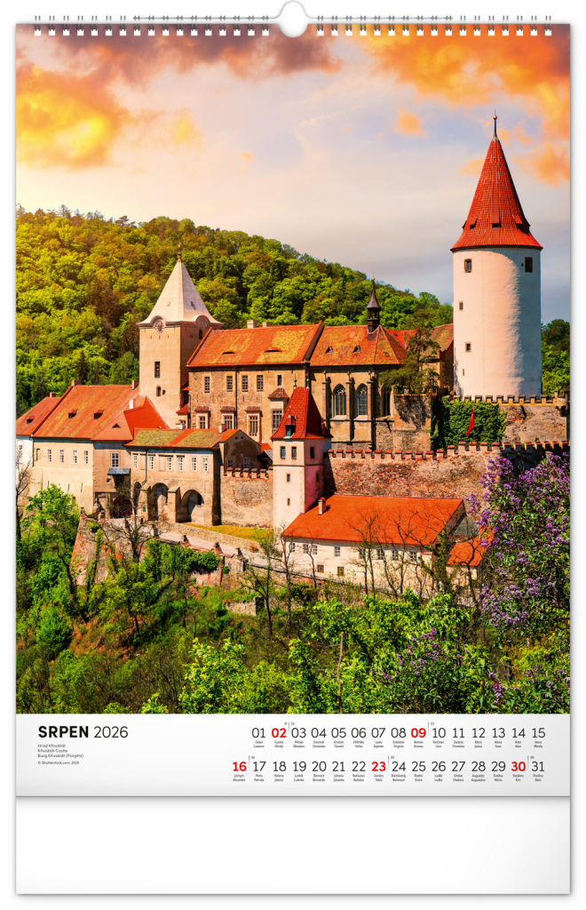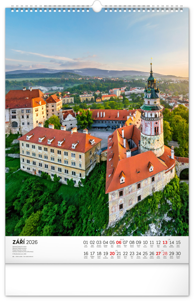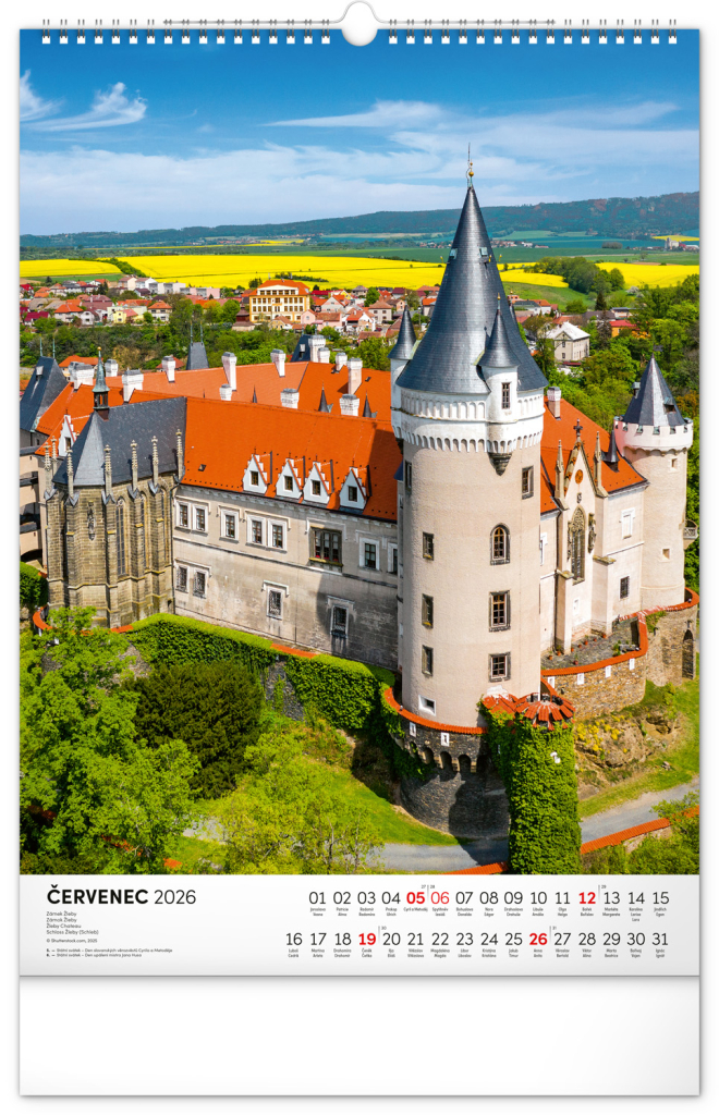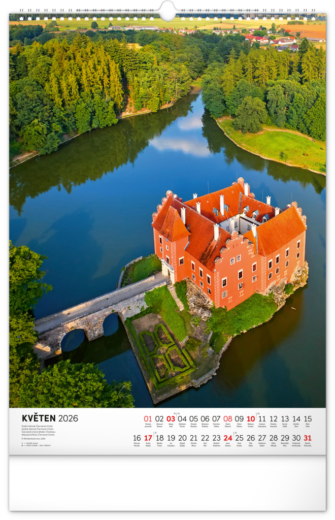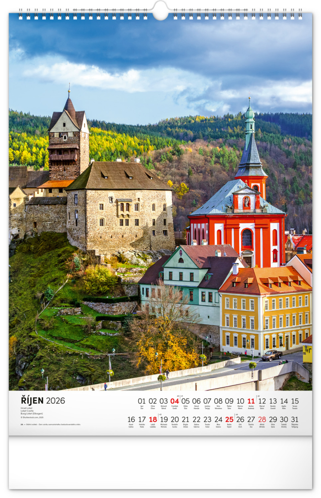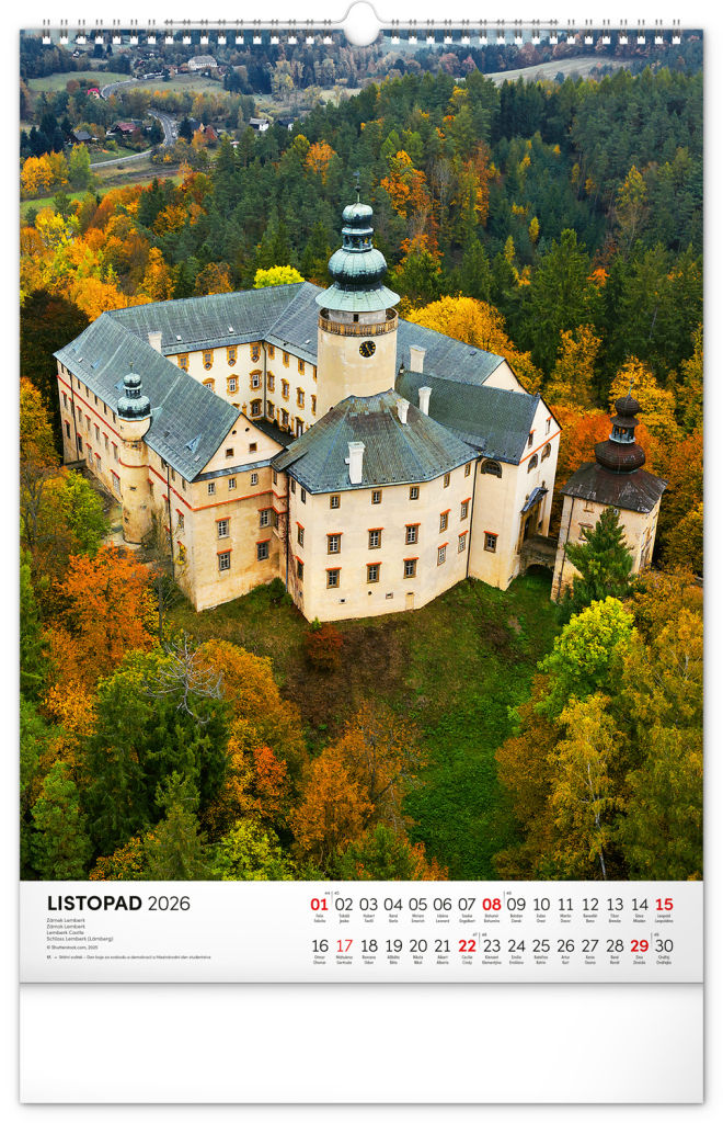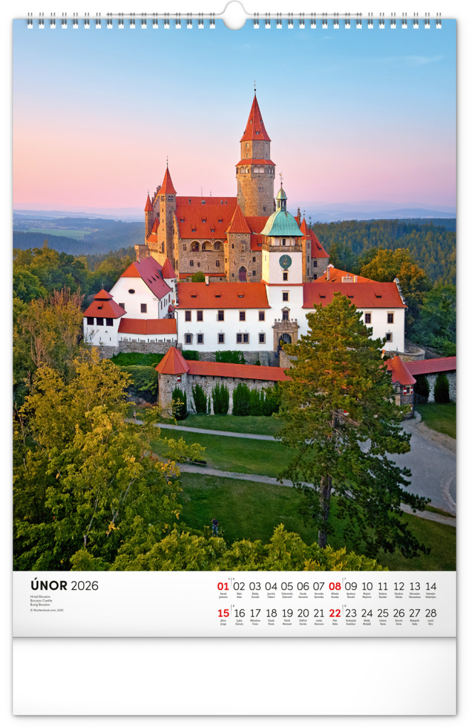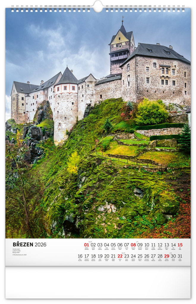 Barevné fotografie Lokte, Lednice, Hluboké či Bouzova na stránkách nástěnného kalendáře ve výškovém formátu. Jednoduché kalendárium s českými svátky a jmény.