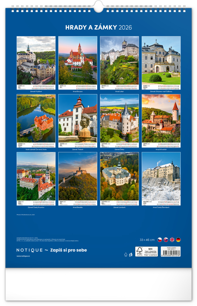 NOTIQUE Nástěnný kalendář Hrady a zámky 2026, 33 x 46 cm