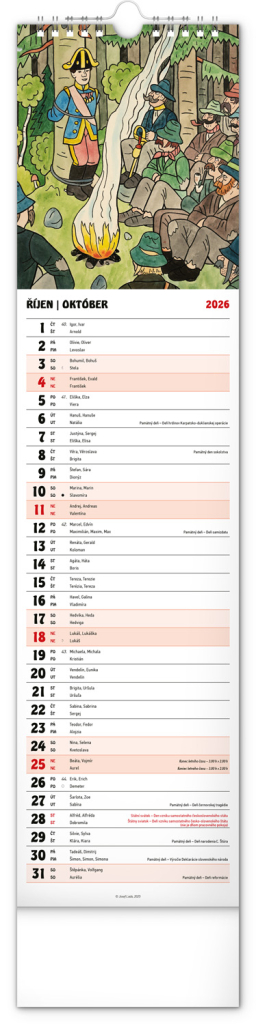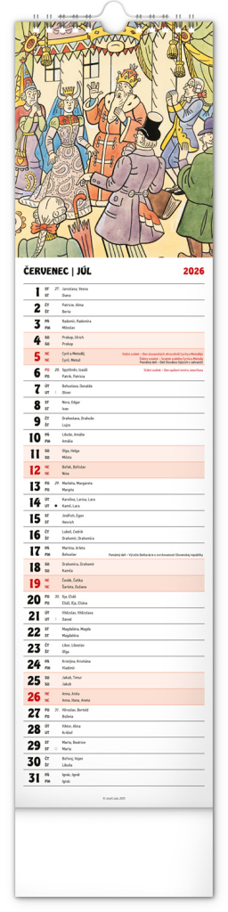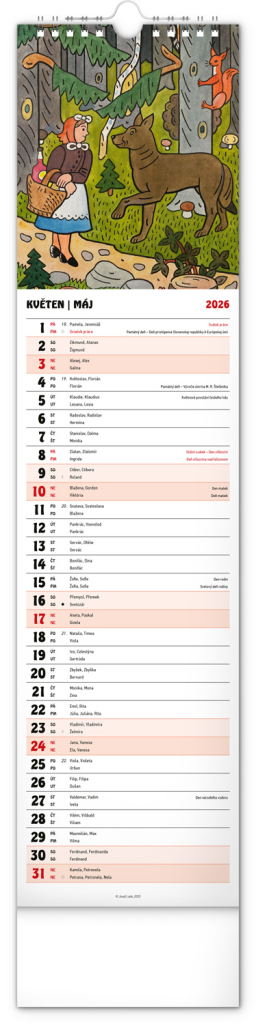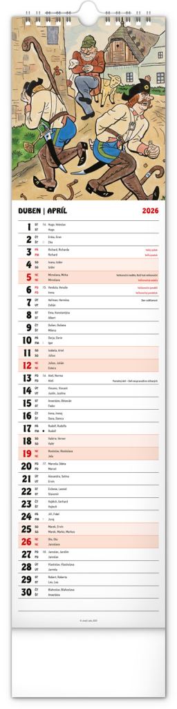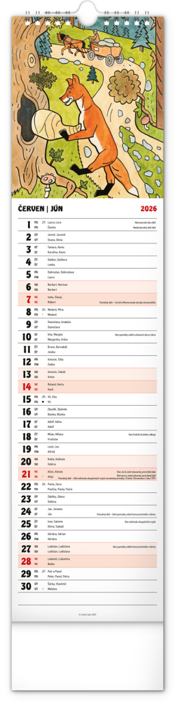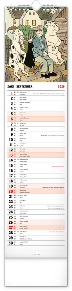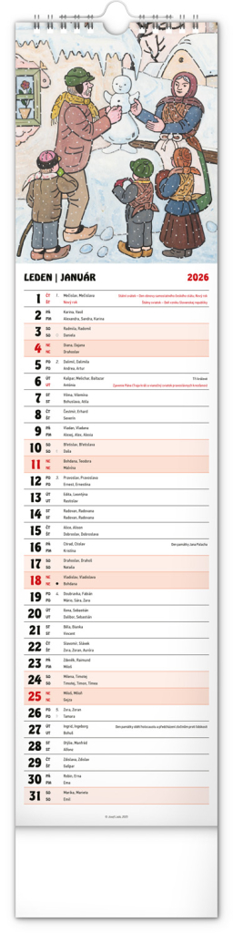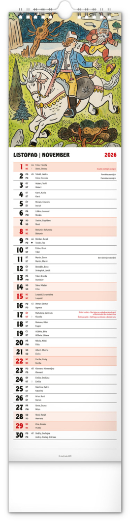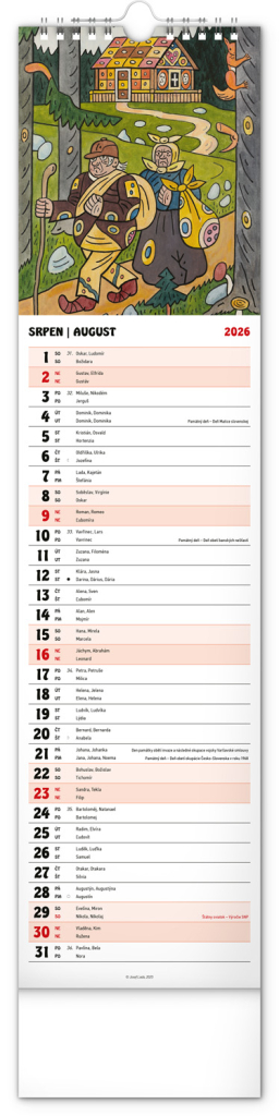 Nástěnný kalendář s ilustracemi Josefa Lady a jeho pohádkovými motivy je vyhotoven v oblíbeném úzkém formátu, který osvěží každý interiér. V kalendáři je rovnocenně zahrnuta čeština a slovenština, ilustrace doplňují česká a slovenská jména, svátky, památné dny a měsíční fáze. Každý den má prostor pro poznámky, víkendové dny jsou barevně odlišené od pracovních.