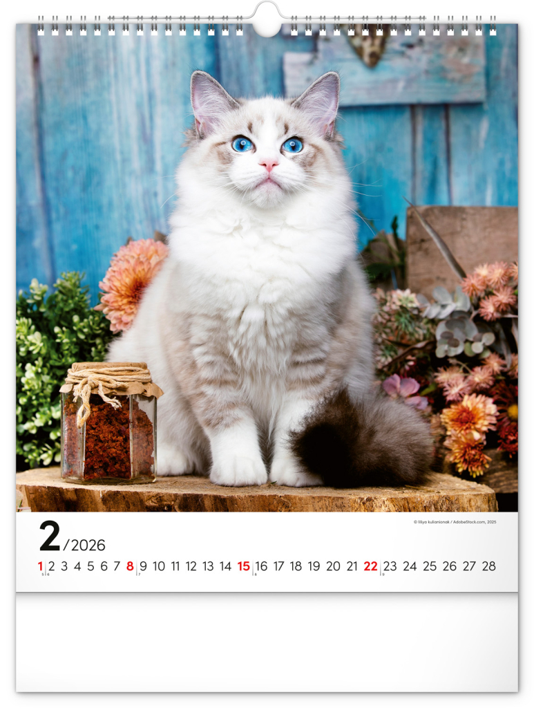 Fotografie osobitých koček na stránkách oblíbeného nástěnného kalendáře s univerzálním kalendáriem na bílém pozadí.