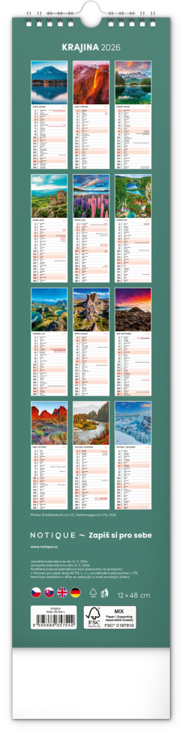 NOTIQUE Nástěnný kalendář Krajina 2026, 12 x 48 cm