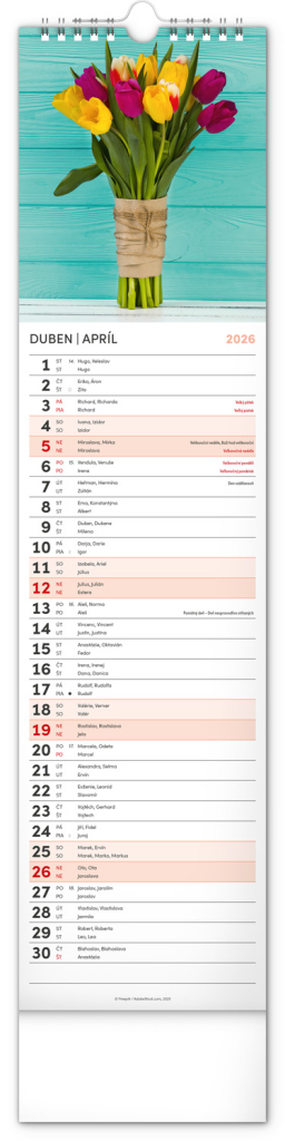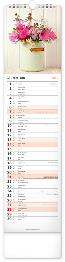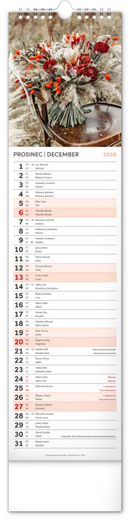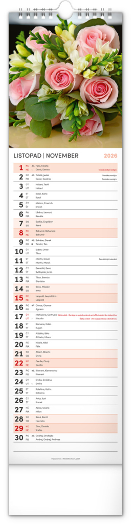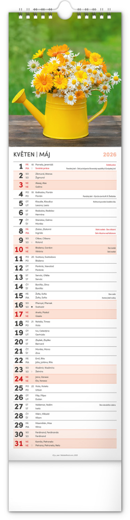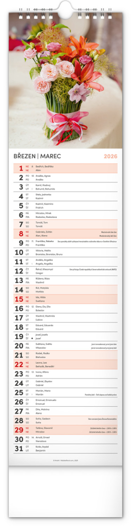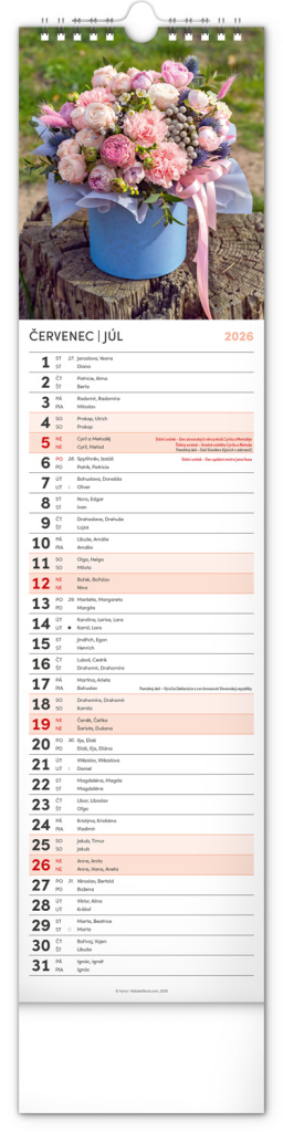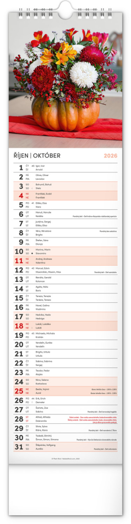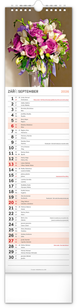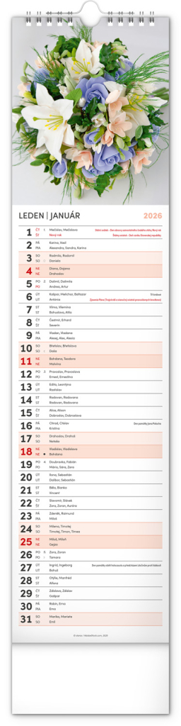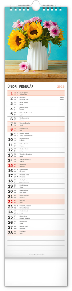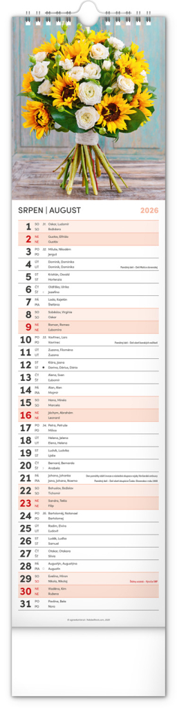 Okrasné květiny a květinová aranžmá na stránkách nástěnného kalendáře v praktickém kravatovém formátu, který se vejde opravdu všude. V česko-slovenském kalendáři je rovnocenně zahrnuta čeština a slovenština, česká a slovenská jména, svátky, památné dny i měsíční fáze. V každém dni je prostor pro poznámky.
