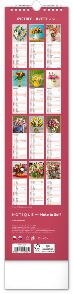 NOTIQUE Nástěnný kalendář Květiny – Kvety 2026, 12 x 48 cm