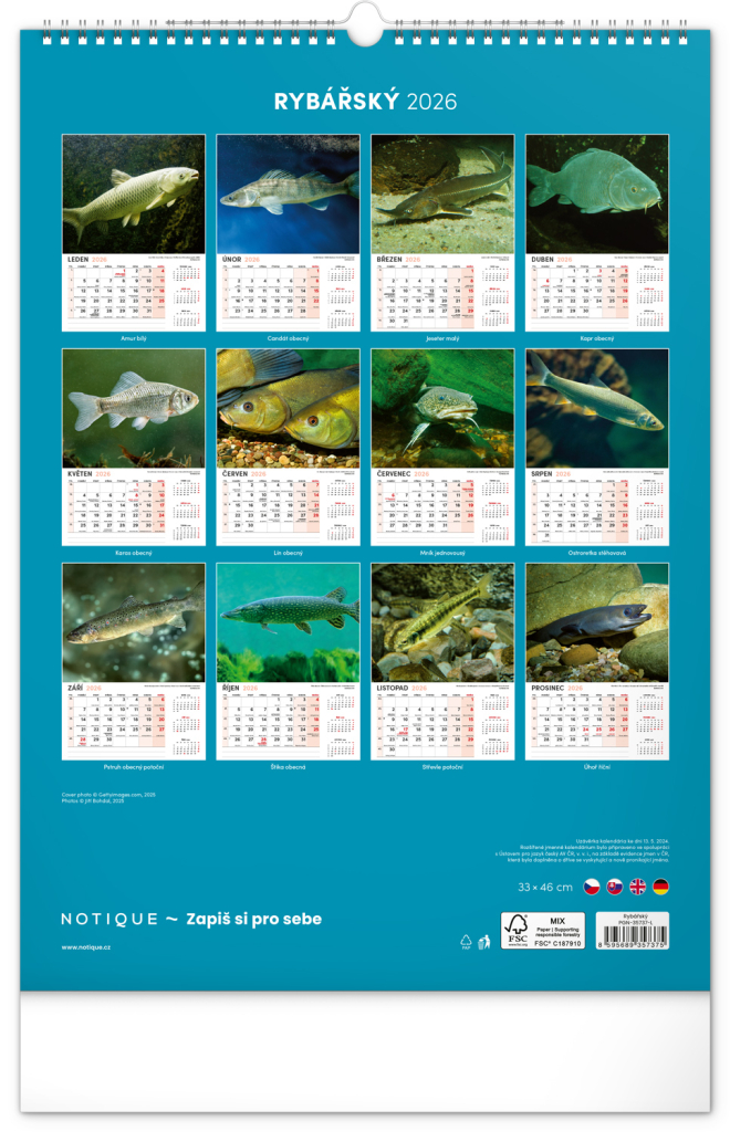 NOTIQUE Nástěnný kalendář Rybářský 2026, 33 x 46 cm