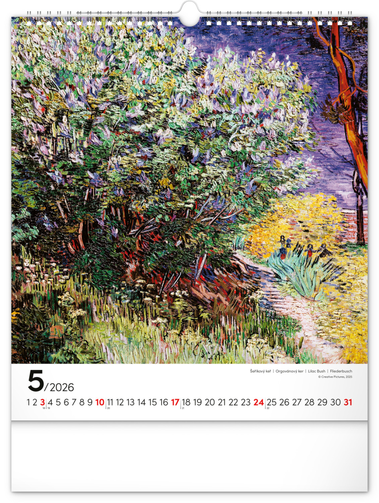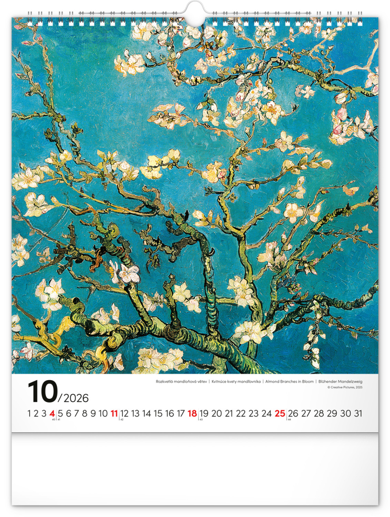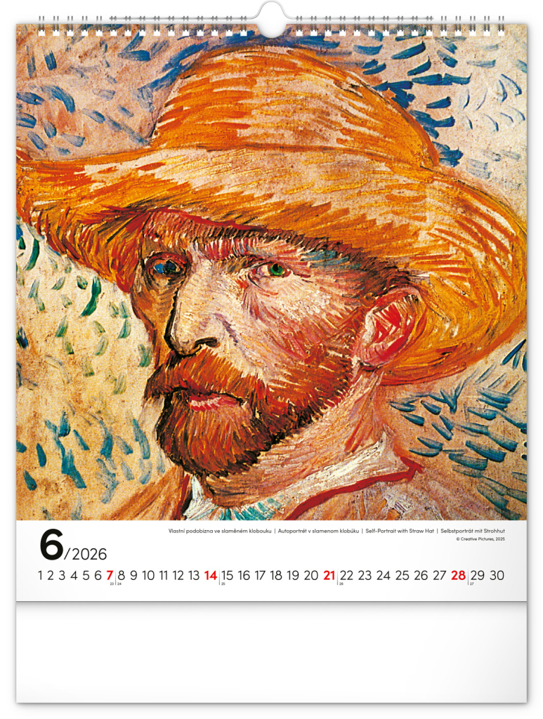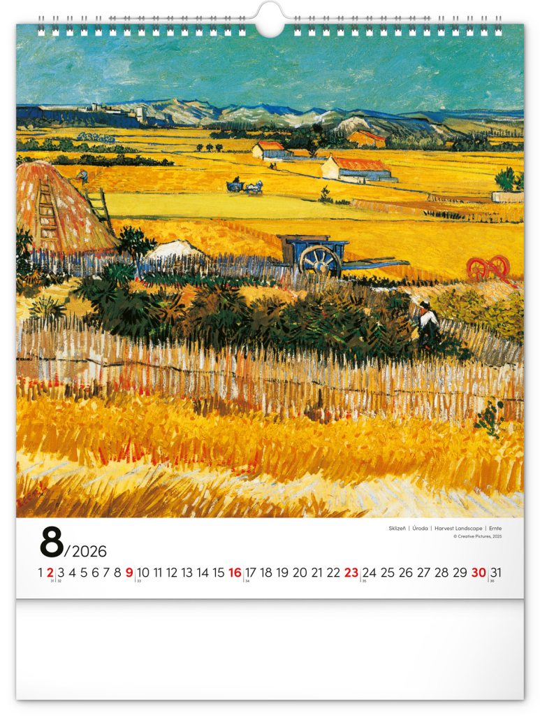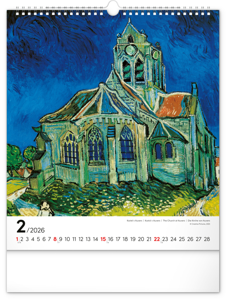 Na stranách kalendáře v obdélníkovém formátu naleznete nejznámější van Goghova díla vytištěná na kvalitním papíře s vysokou gramáží. Kalendář obsahuje univerzální kalendárium a popisky ve čtyřech jazycích.