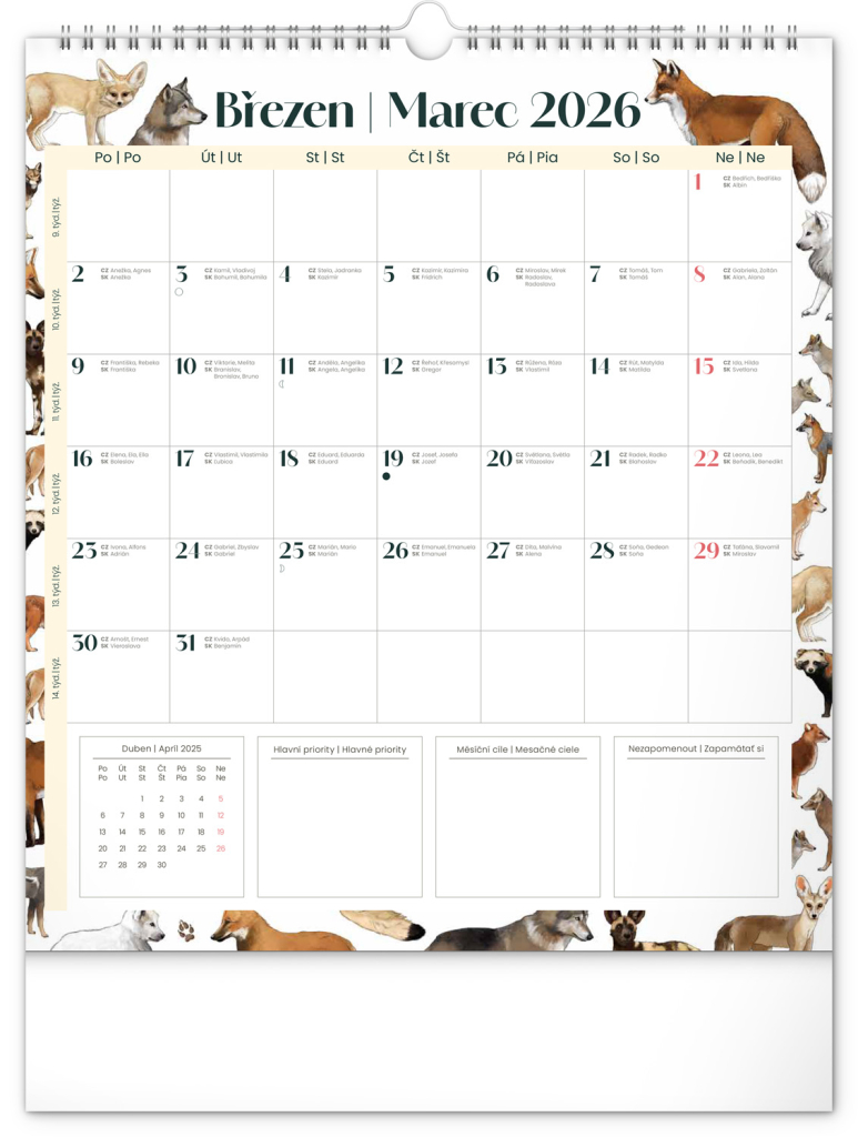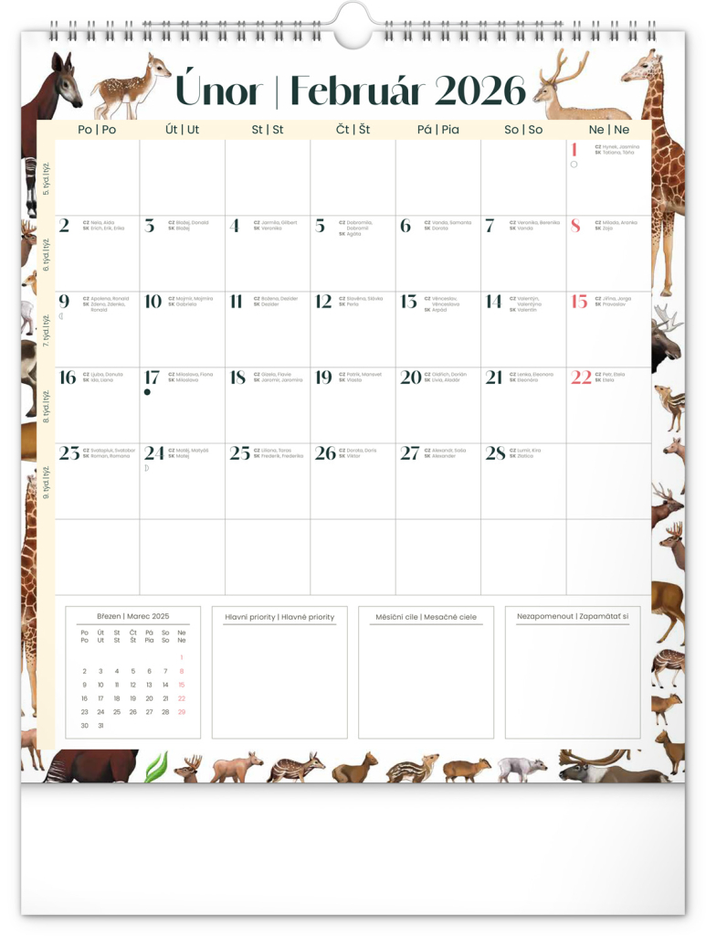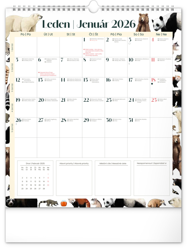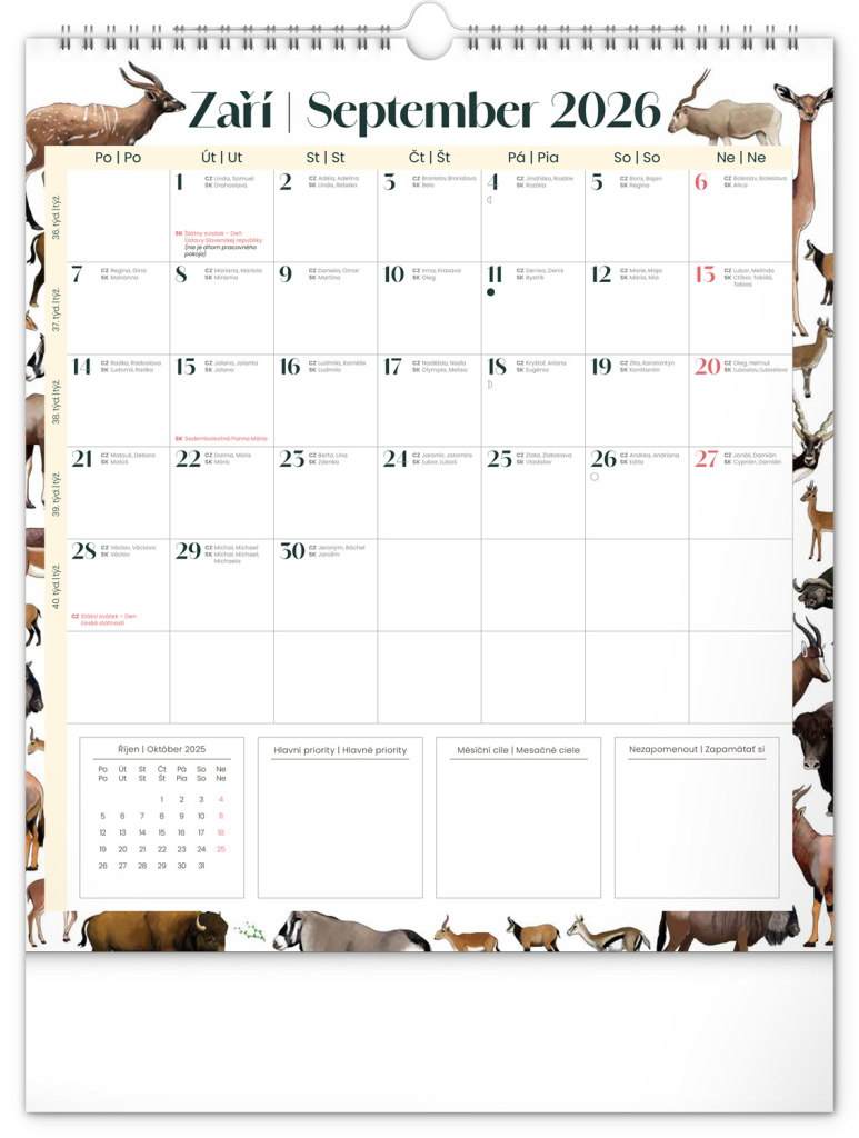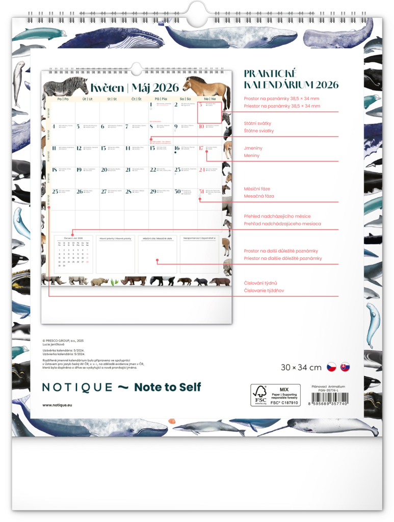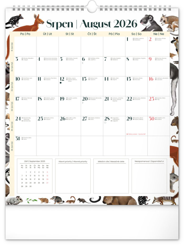 Kalendář obsahuje české a slovenské kalendárium a krásné ilustrace zvířat. Nechybí státní svátky ani měsíční fáze.