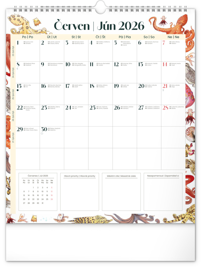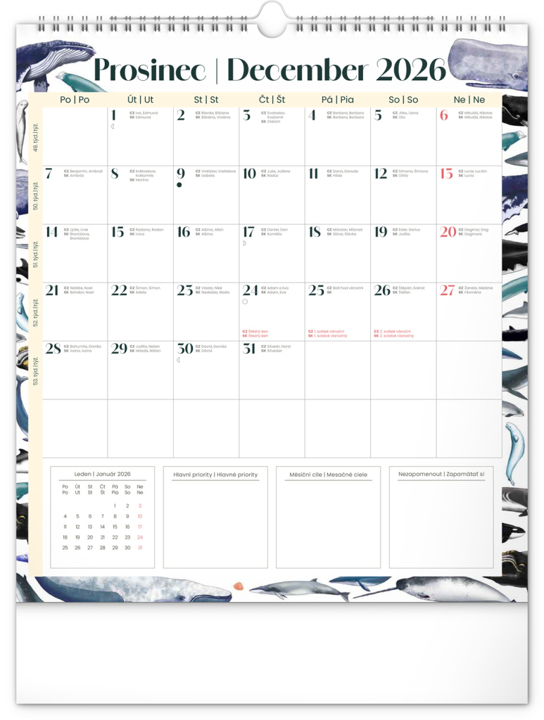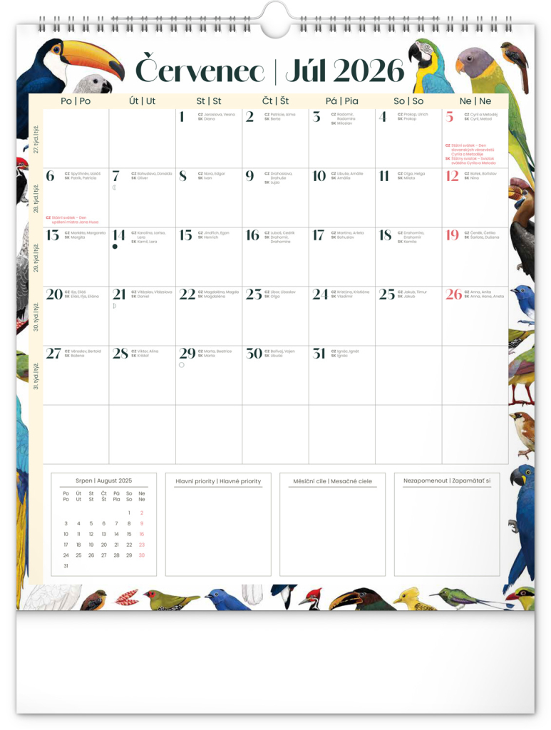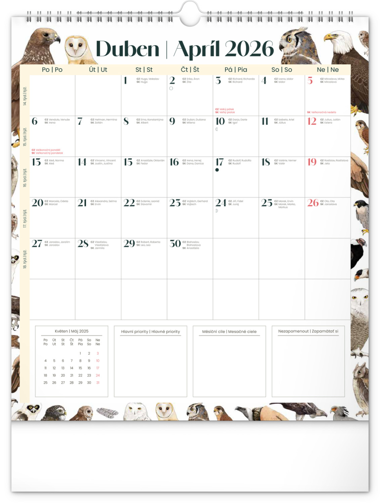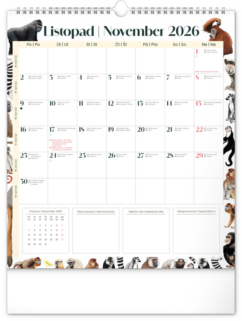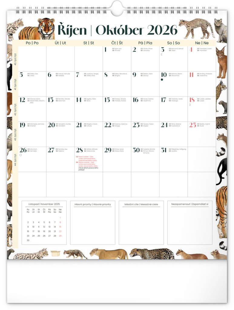 Kalendář obsahuje české a slovenské kalendárium a krásné ilustrace zvířat. Nechybí státní svátky ani měsíční fáze.