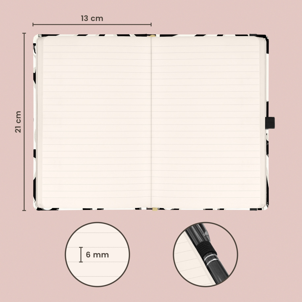 Kvalitní linkovaný notes v pevných deskách s uzavíráním na gumičku, poutkem na tužku a vnitřní kapsou na drobnosti. Uvnitř najdete 172 tečkovaných stran na žlutém papíře pro zapsání všech vašich nápadů. Linkovaný zápisník můžete použít jako deník, psát do něj hluboké myšlenky nebo pracovní poznámky.