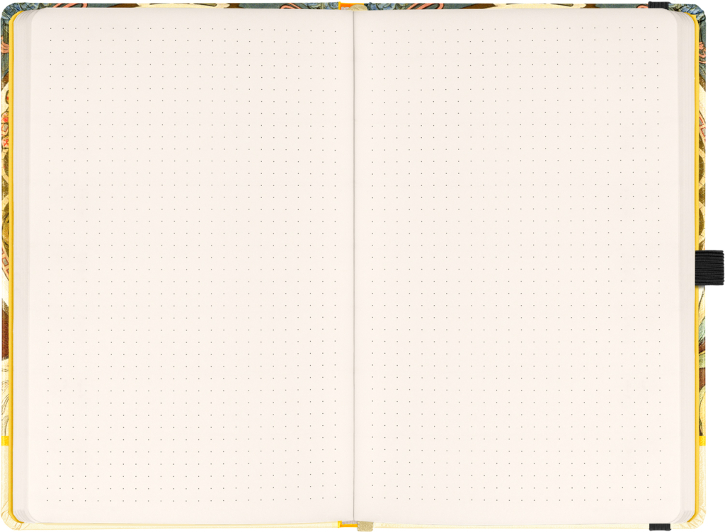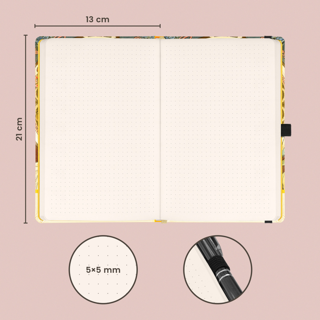 Notes v pevných deskách s motivem díla Alfonse Muchy, s uzavíráním na gumičku, kapsou na drobnosti a poutkem na tužku. Vevnitř najdete 172 tečkovaných stran na žlutém papíře pro zapsání všech vašich nápadů.