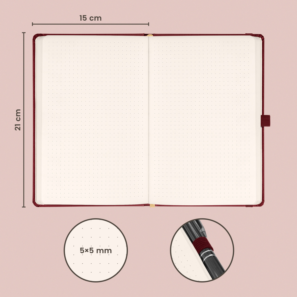 Tečkovaný notes Balacron v provedení bordó. Povrch diáře si získal oblibu díky kvalitnímu svrchnímu materiálu, který je extrémně odolný vůči vnějšímu poškození.