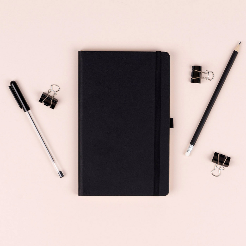 Praktický a lehký linkovaný notes v klasické černé barvě má povrch s hrubší strukturou, na který si můžete nechat vyrazit logo společnosti. Notes má pevnou knižní vazbu a zakulacené rohy, poutko na tužku, elastickou gumičku a textilní záložku. Linky mají 6 mm a jsou na kvalitním žlutém papíře.