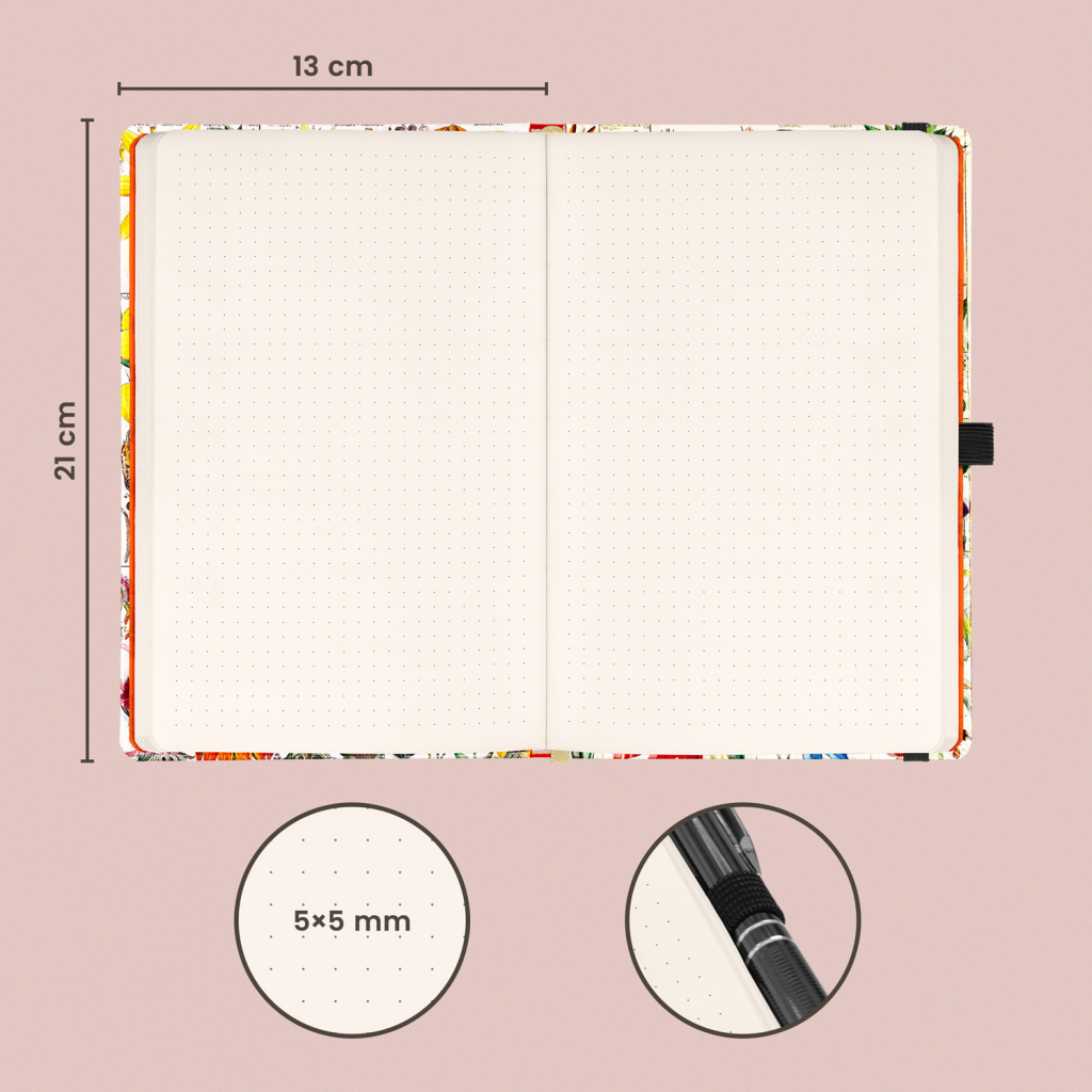 Notes v pevných deskách z kolekce Kateřiny Winterové s ilustracemi květin, s uzavíráním na gumičku, kapsou na drobnosti a poutkem na tužku. Vevnitř najdete 172 tečkovaných stran na žlutém papíře pro zapsání všech vašich nápadů.