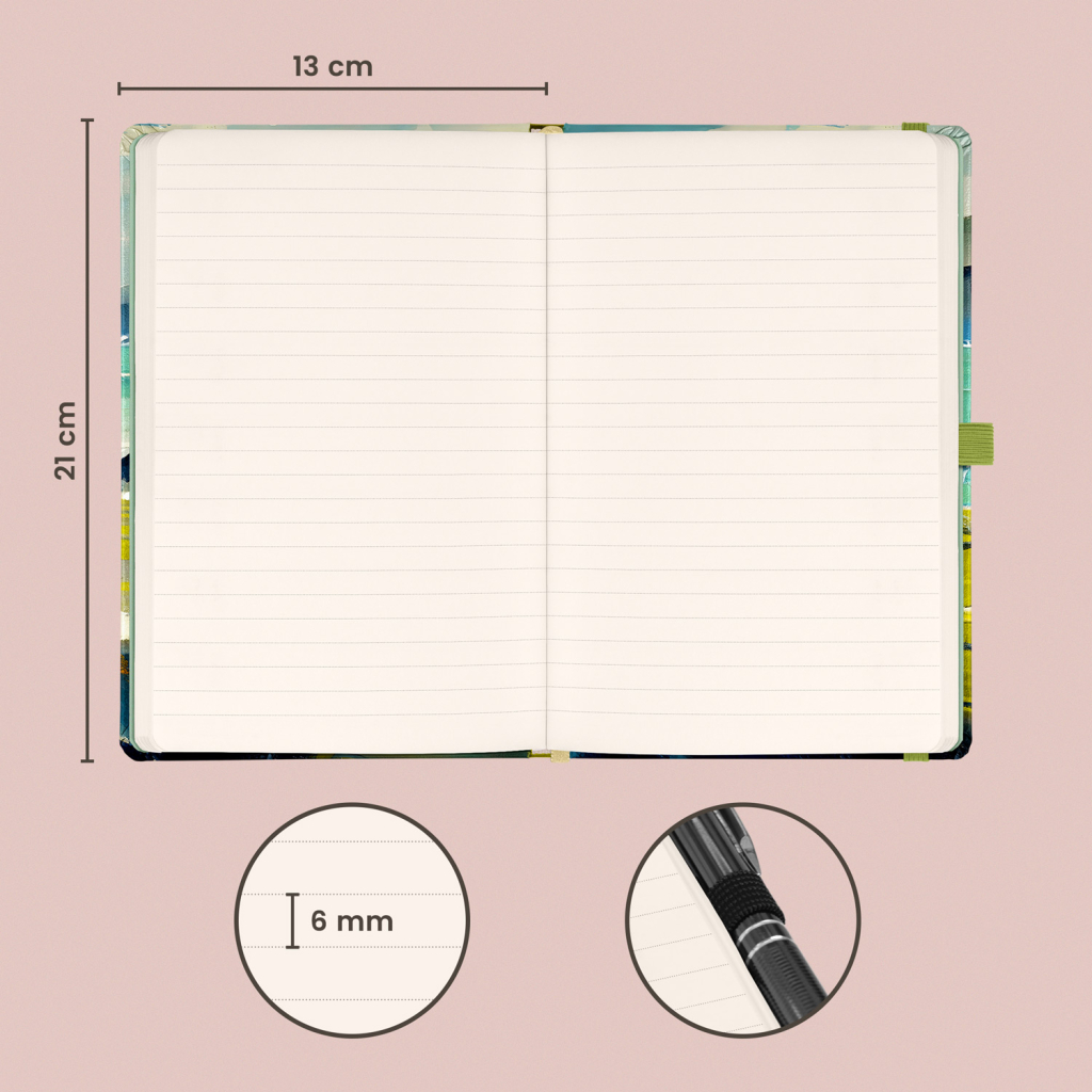 Kvalitní linkovaný notes v pevných deskách s uzavíráním na gumičku, poutkem na tužku a vnitřní kapsou na drobnosti. Uvnitř najdete 172 tečkovaných stran na žlutém papíře pro zapsání všech vašich nápadů. Linkovaný zápisník můžete použít jako deník, psát do něj hluboké myšlenky nebo pracovní poznámky.